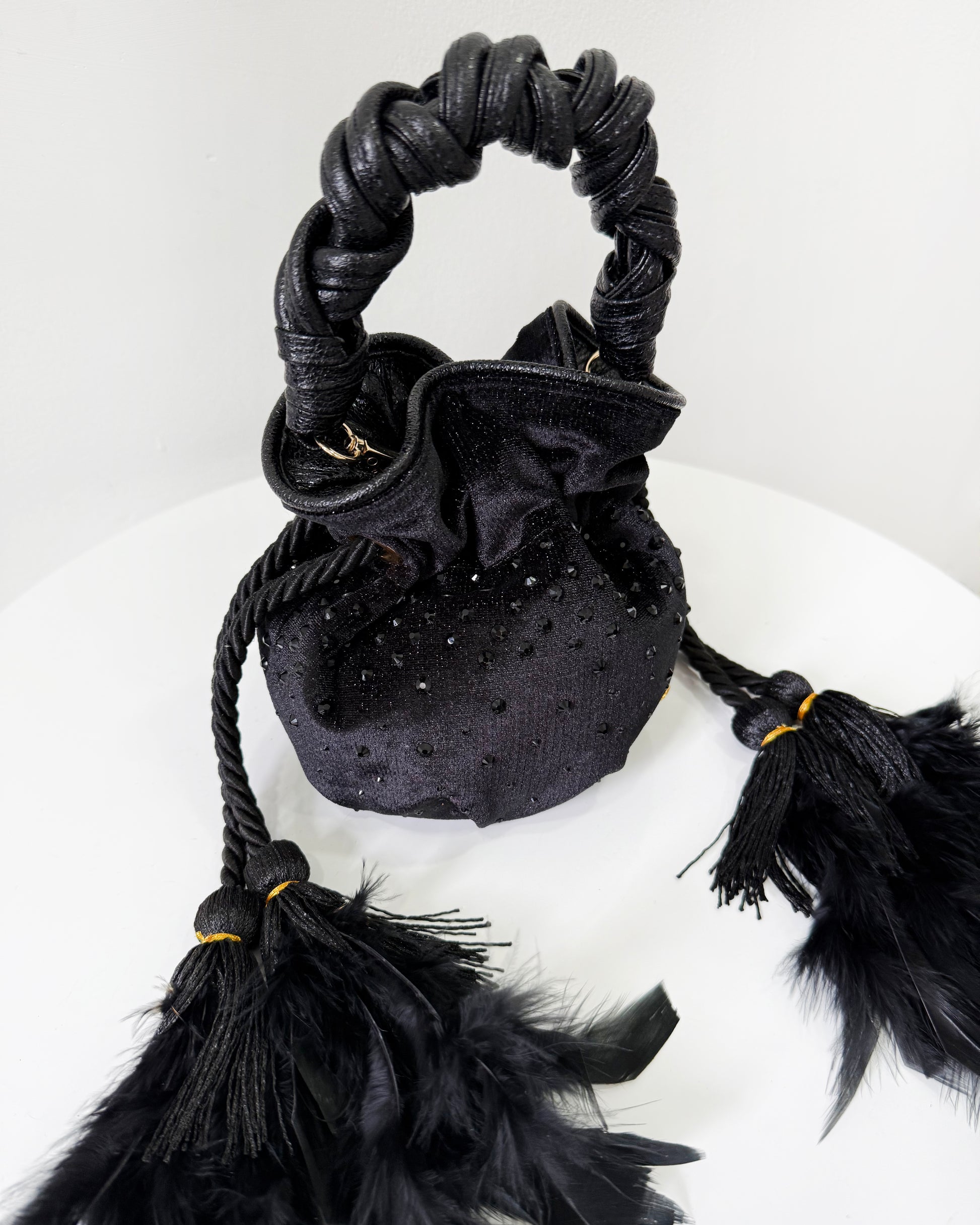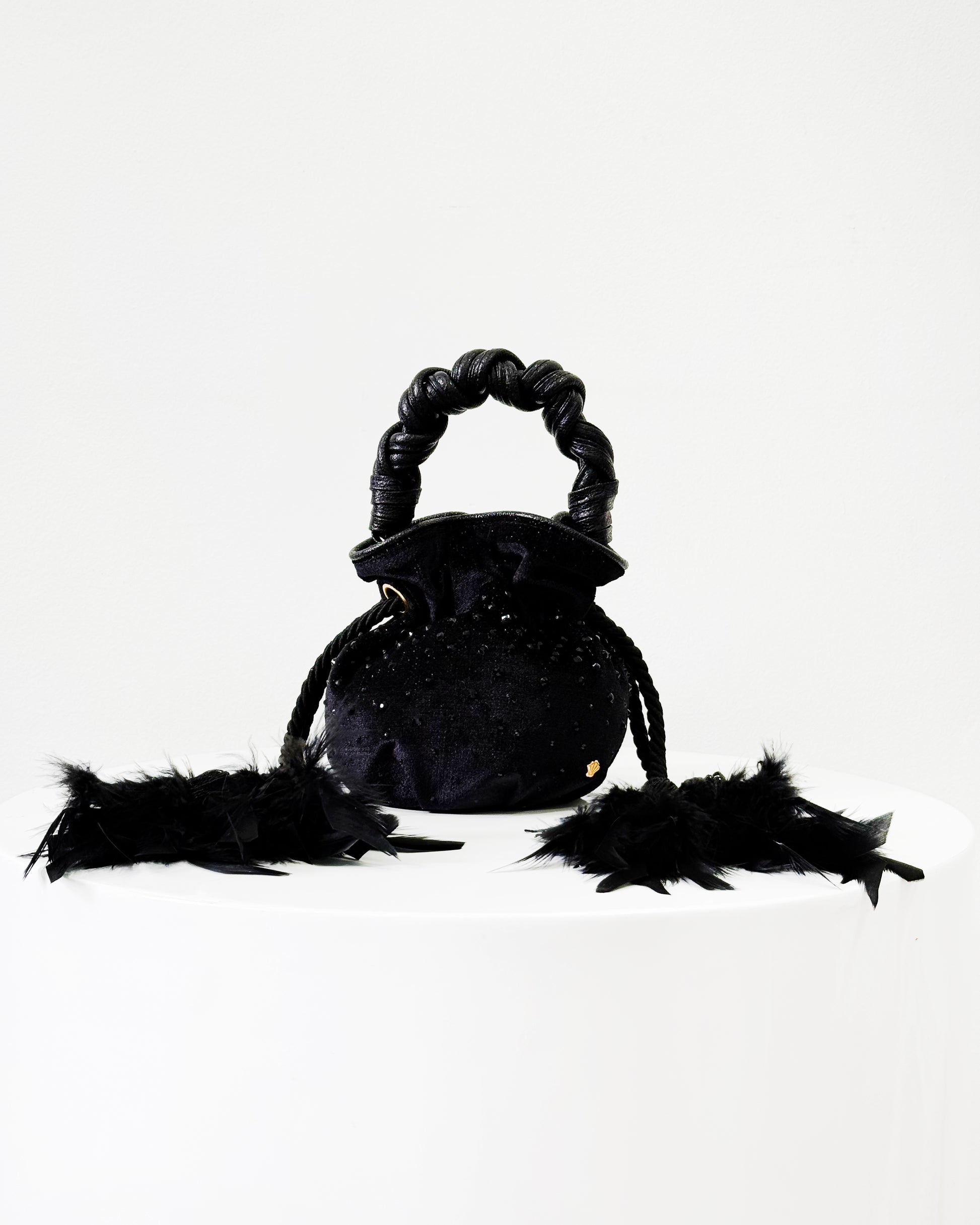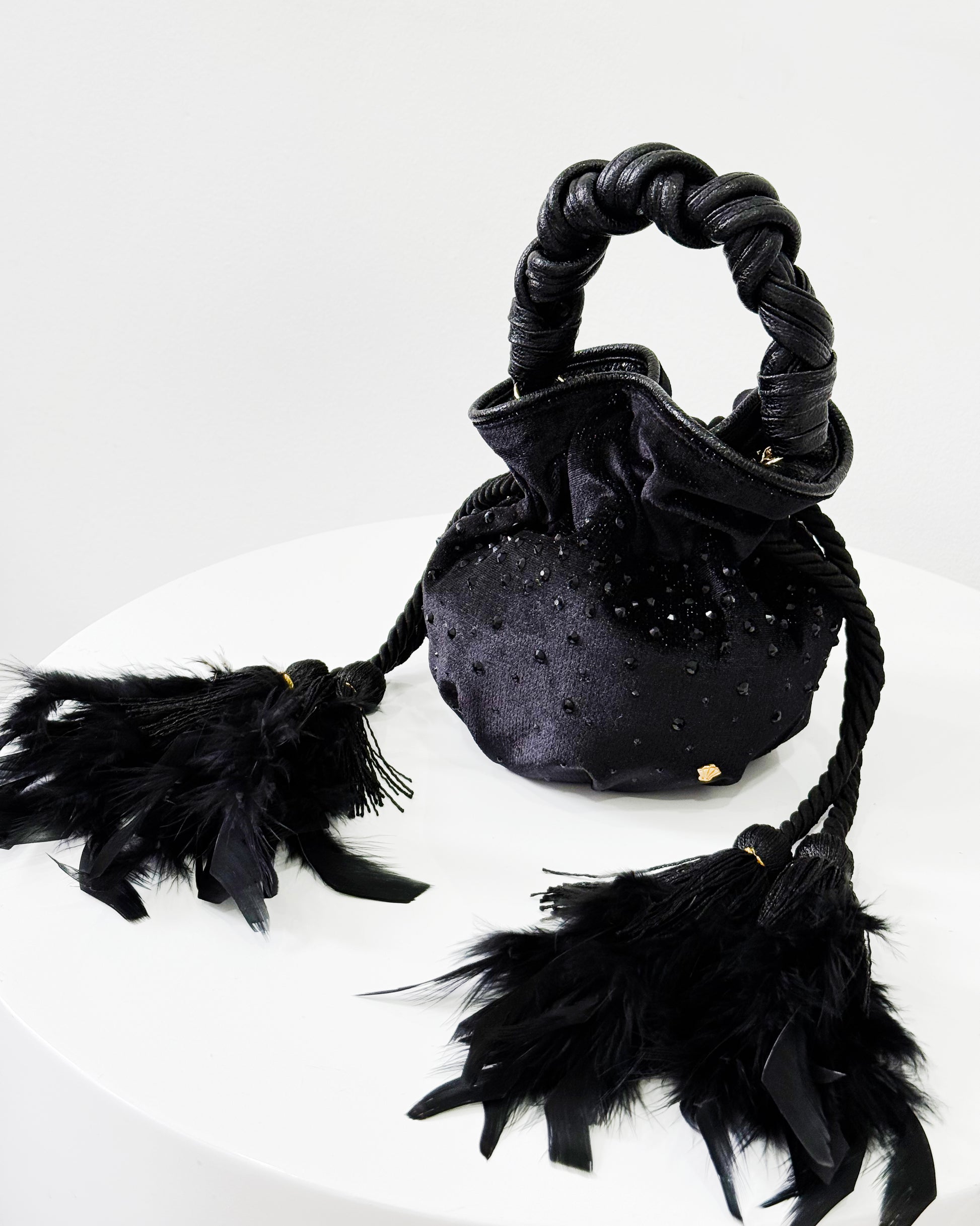 Confeccionada en terciopelo negro premium, enriquecido con sutiles hilos plateados, su superficie cobra vida con destellos elegantes que se revelan bajo la luz nocturna. Está decorada cuidadosamente a mano con cristales negros, aplicados uno a uno, creando un brillo profundo, misterioso y refinado.