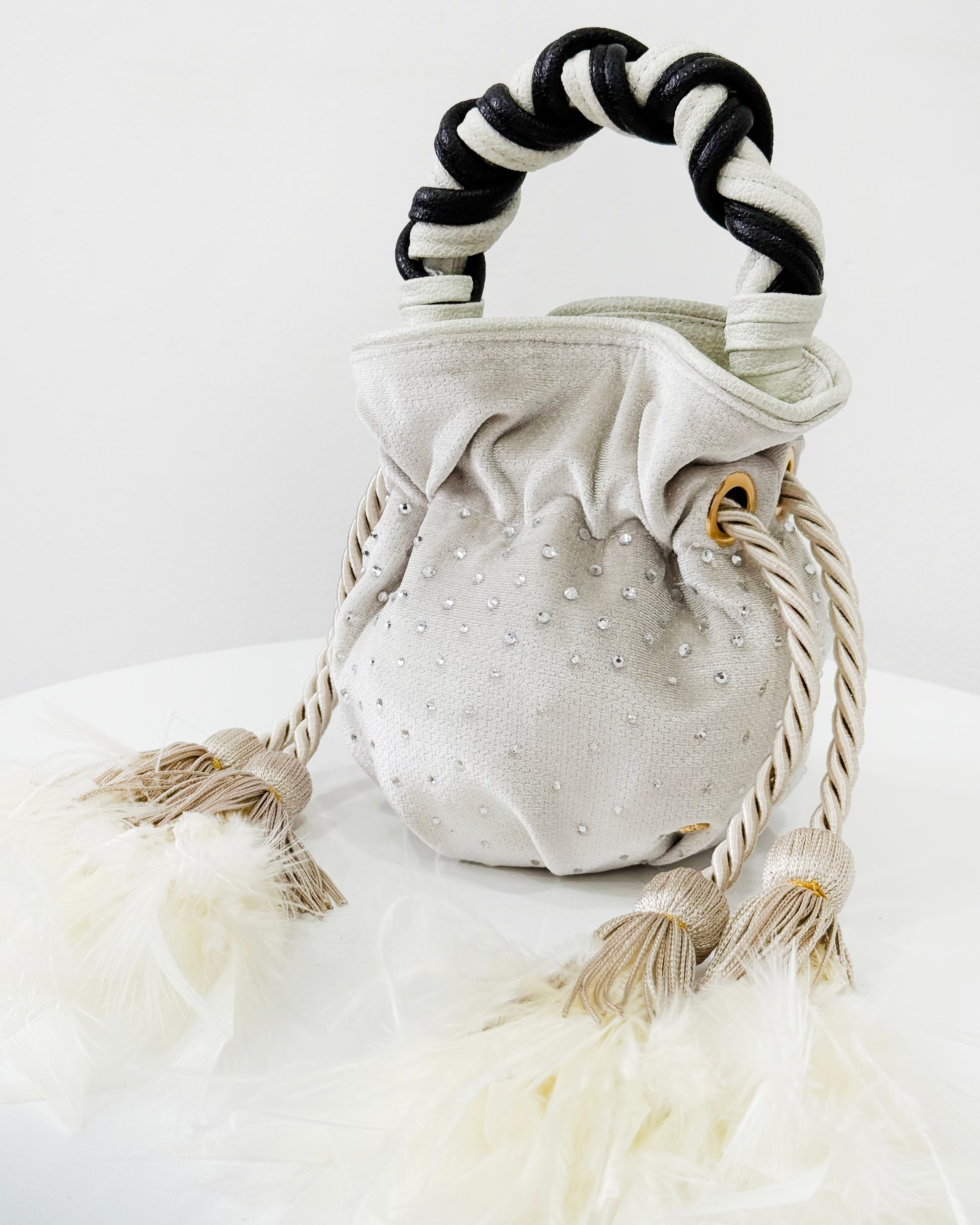 Está confeccionada en terciopelo blanco con delicados hilos plata que aportan destellos sutiles y refinados, evocando la luz que emerge en la oscuridad. Su superficie está cuidadosamente decorada a mano con cristales blancos y plateados, creando un juego de brillo delicado que realza cada movimiento.