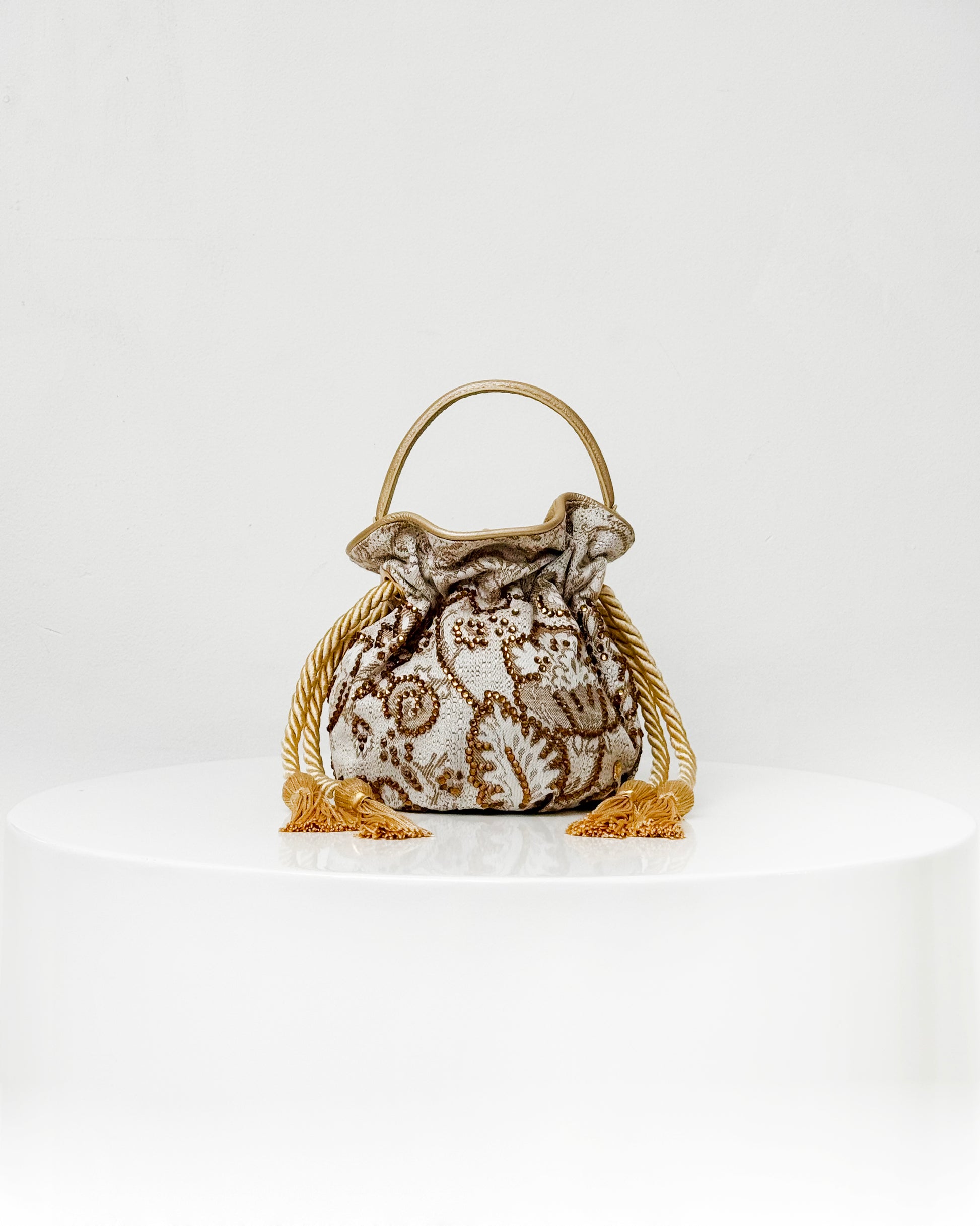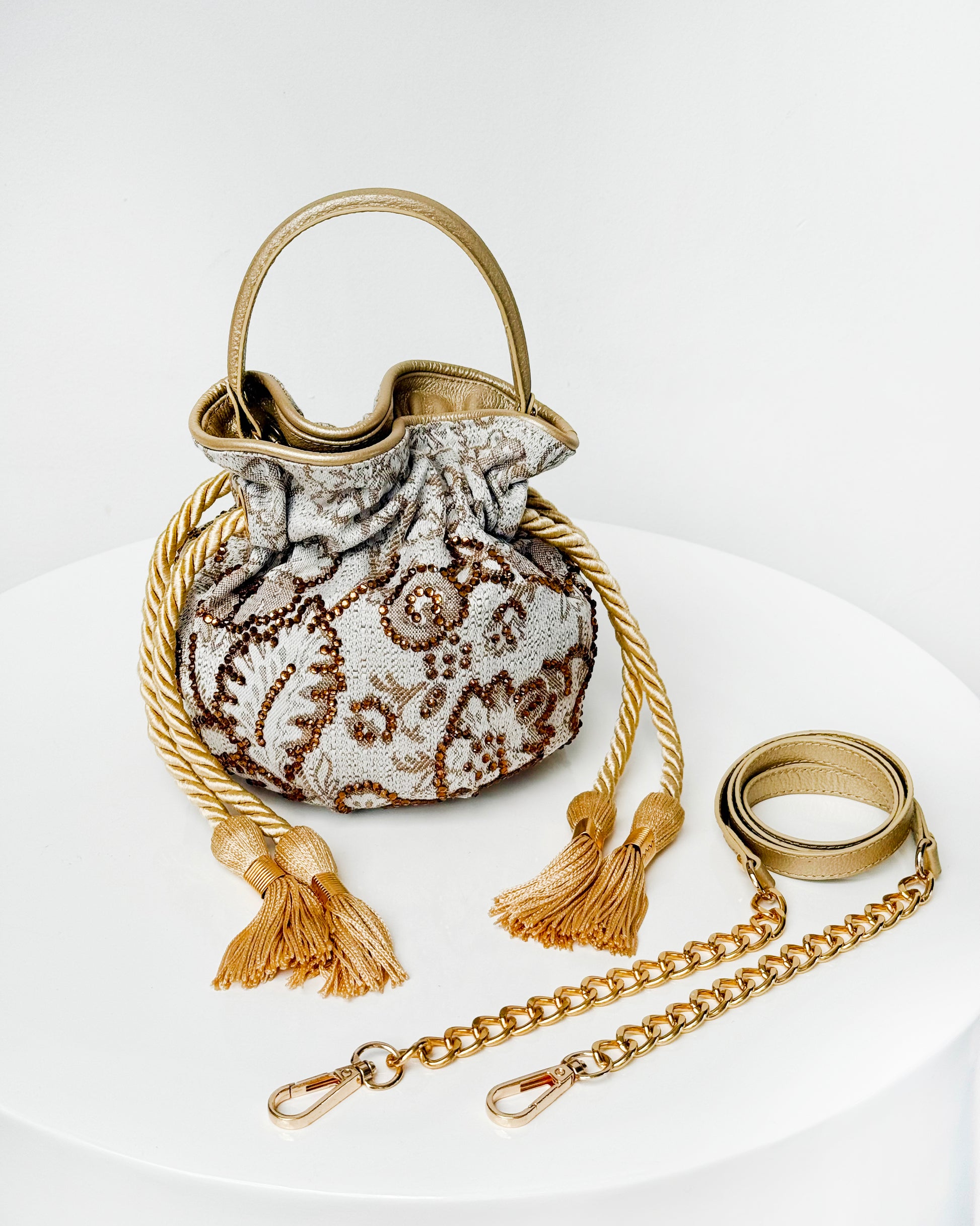 Está confeccionada en Gobelino y cuero vacuno 100% colombiano, con un sistema de cierre en cordones de hilos de seda, rematados con borlas hechas a mano que aportan un toque delicado y sofisticado. Cada bolso está decorado cuidadosamente a mano con cristales DMC, y terminado con herrajes en zamac con baño en oro de 24K.