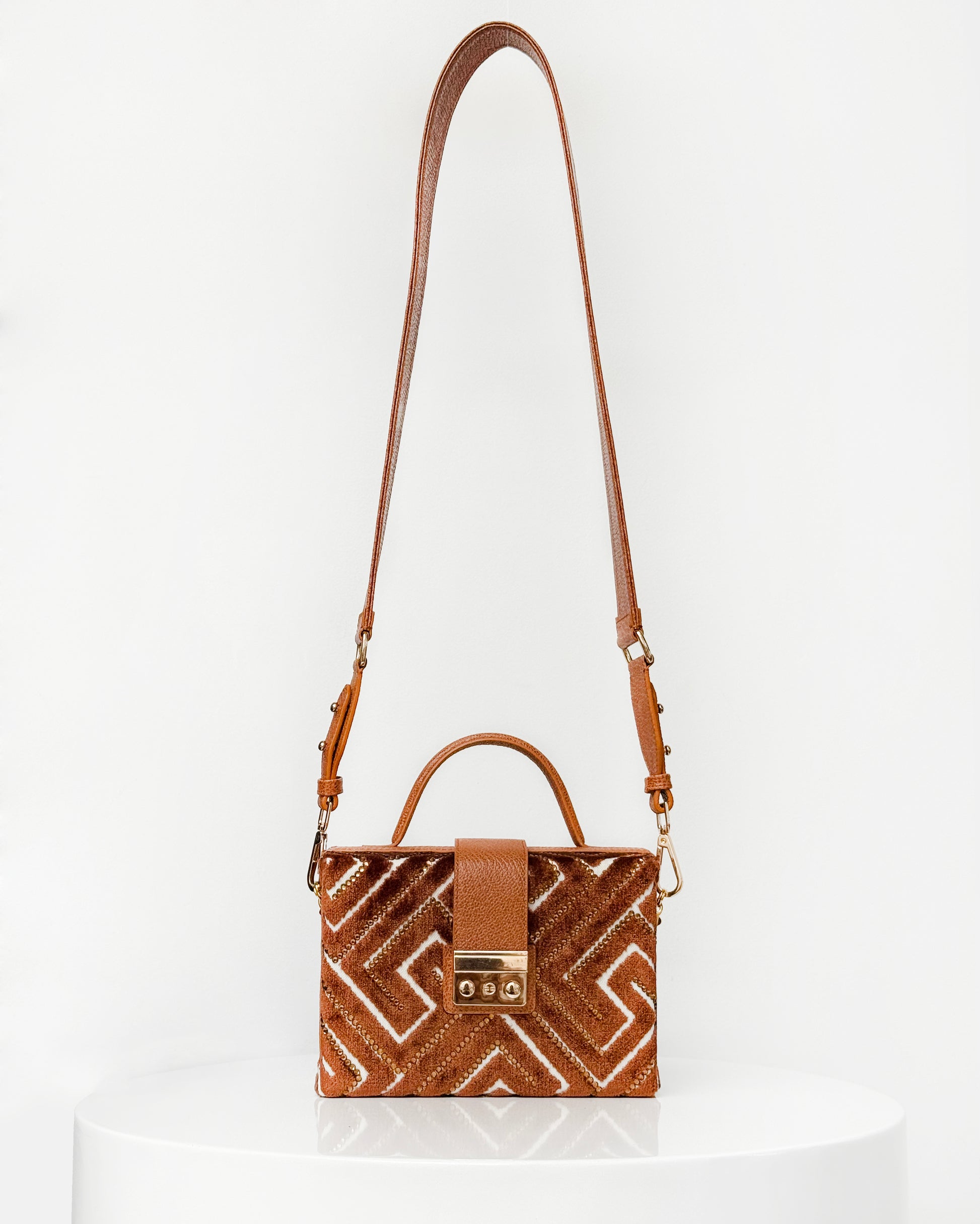 El Box Clutch Rávena es una pieza de lujo artesanal colombiano, elaborada en cuero 100% colombiano y una exquisita mezcla de tela en terciopelo fino, que aporta riqueza visual y una textura elegante.