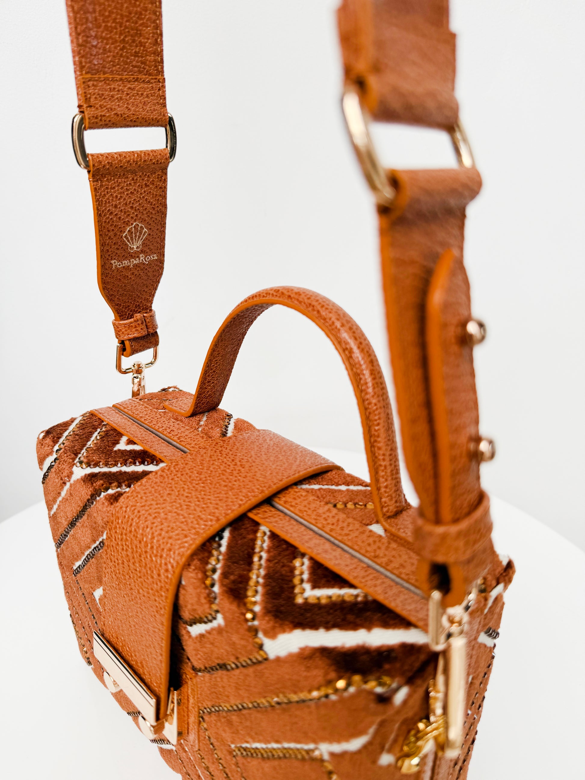 Su sistema de cierre con broche de lujo brinda seguridad y evoca la sensación de un baúl antiguo lleno de secretos, mientras que sus herrajes en zamac con baño en oro de 24K reflejan la calidad y el detalle artesanal característico de Pomparosa.