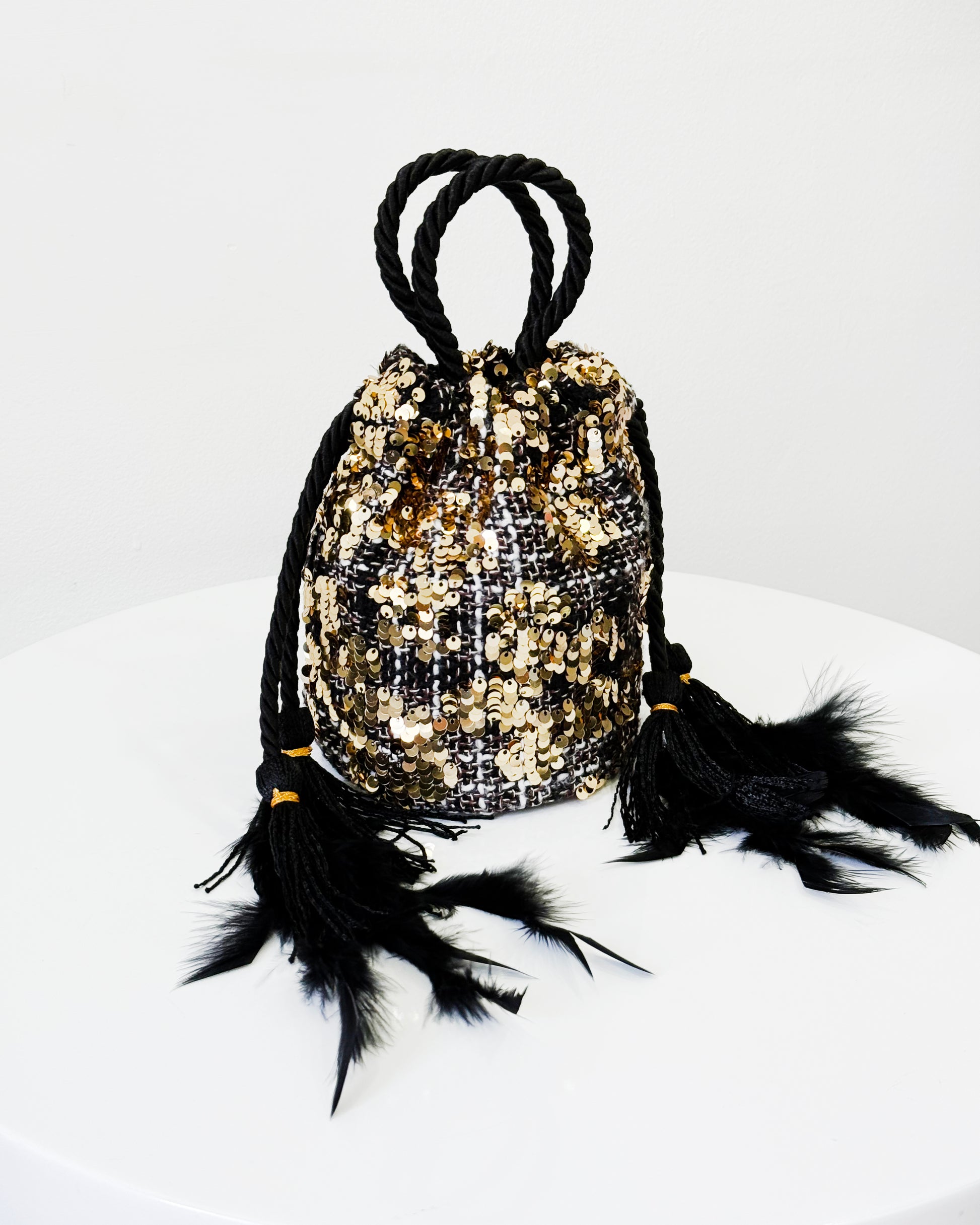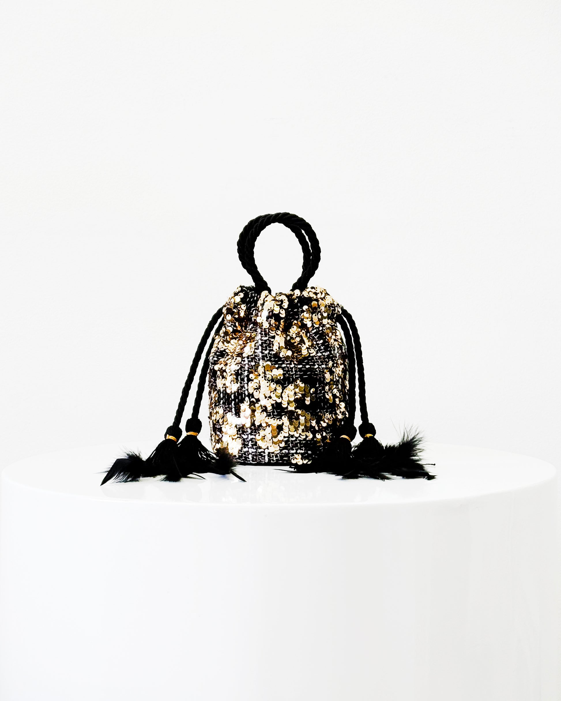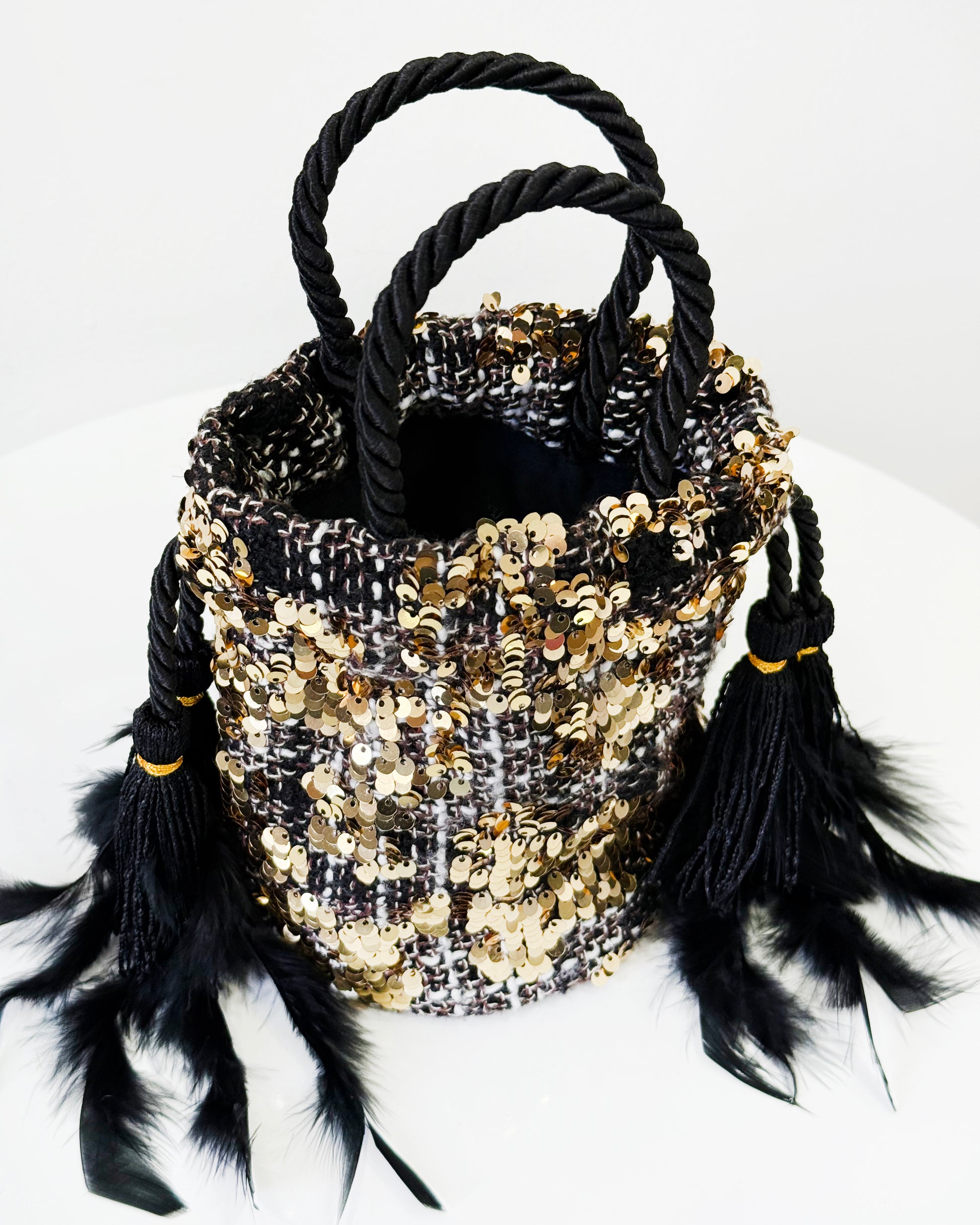 Cada pieza es elaborada de manera artesanal; la disposición de las lentejuelas, plumas y flecos puede variar ligeramente, haciendo de cada Bucket Élise una creación única.
