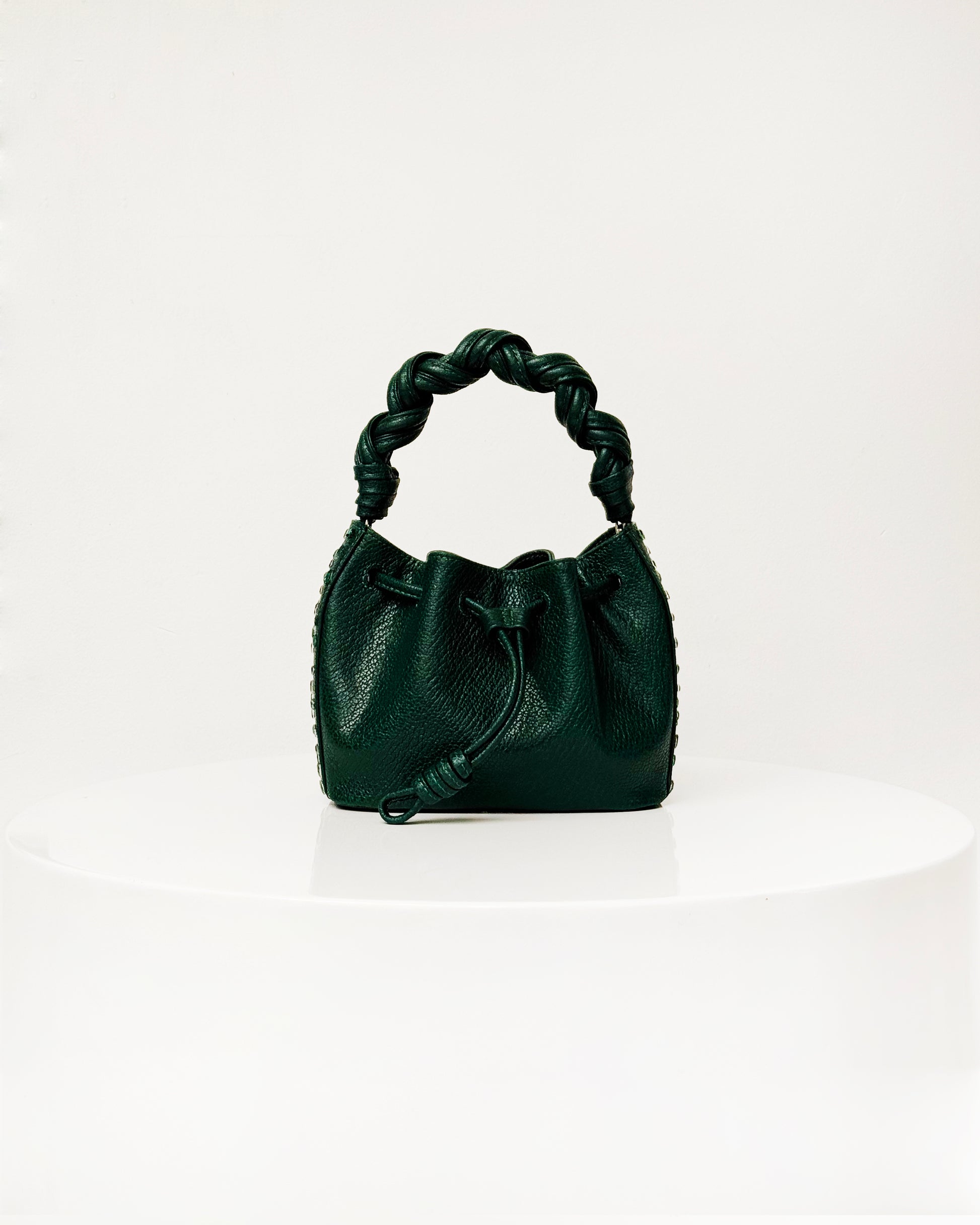 Fuerte, elegante y artesanal, el Bucket Iris Rávena Verde Pino es una pieza especial pensada para mujeres que aman los accesorios con personalidad y lujo hecho a mano.