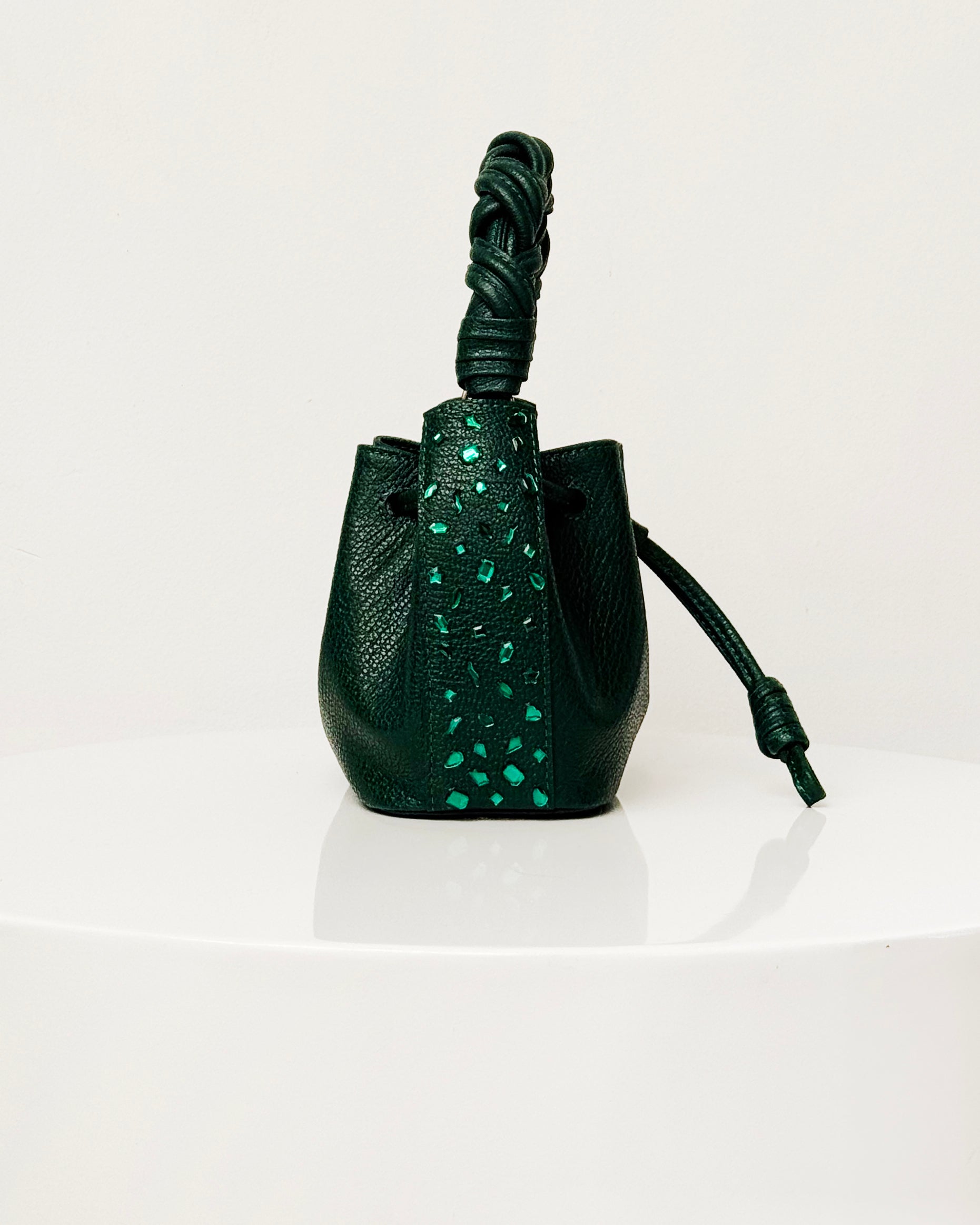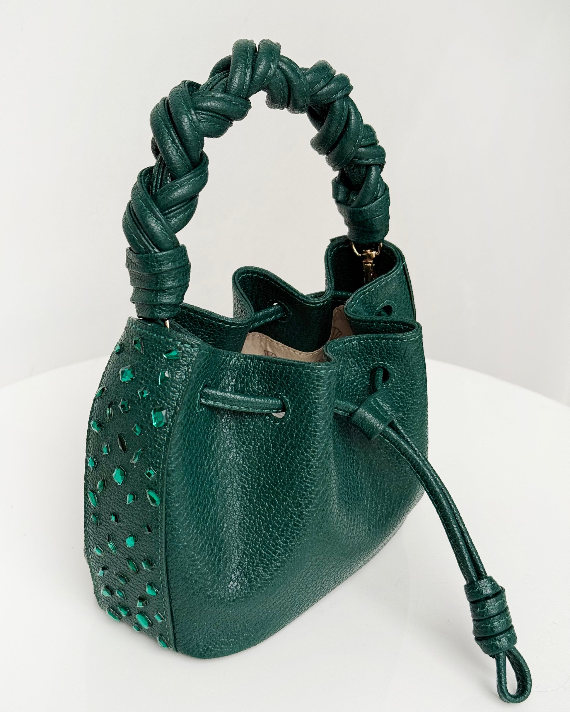 El Bucket Iris Rávena es una mini cartera pequeña, elegante y llena de carácter, elaborada completamente en cuero 100% colombiano en un tono verde profundo, un color atrevido pero clásico, que aporta personalidad manteniendo la esencia atemporal de la colección.