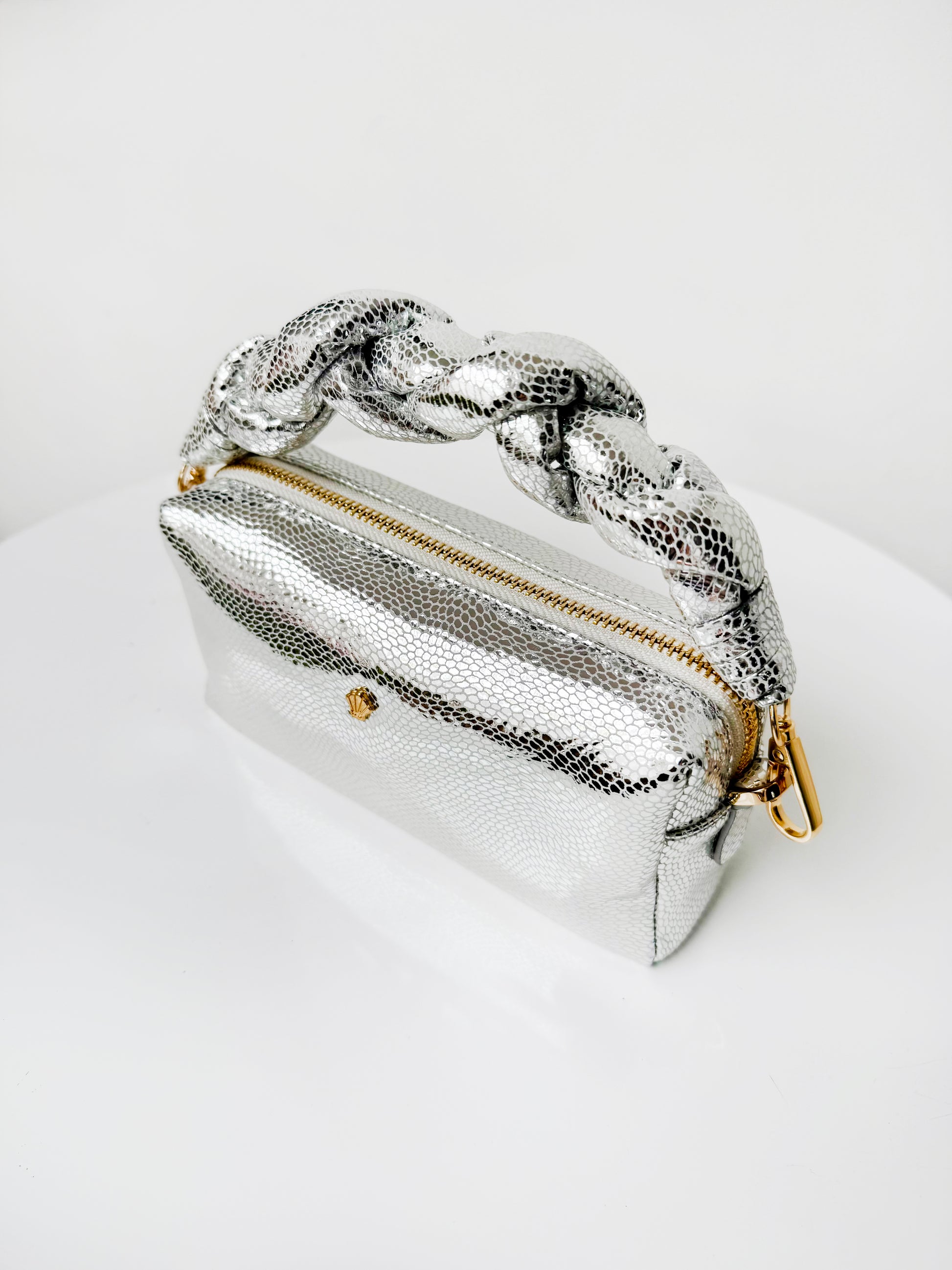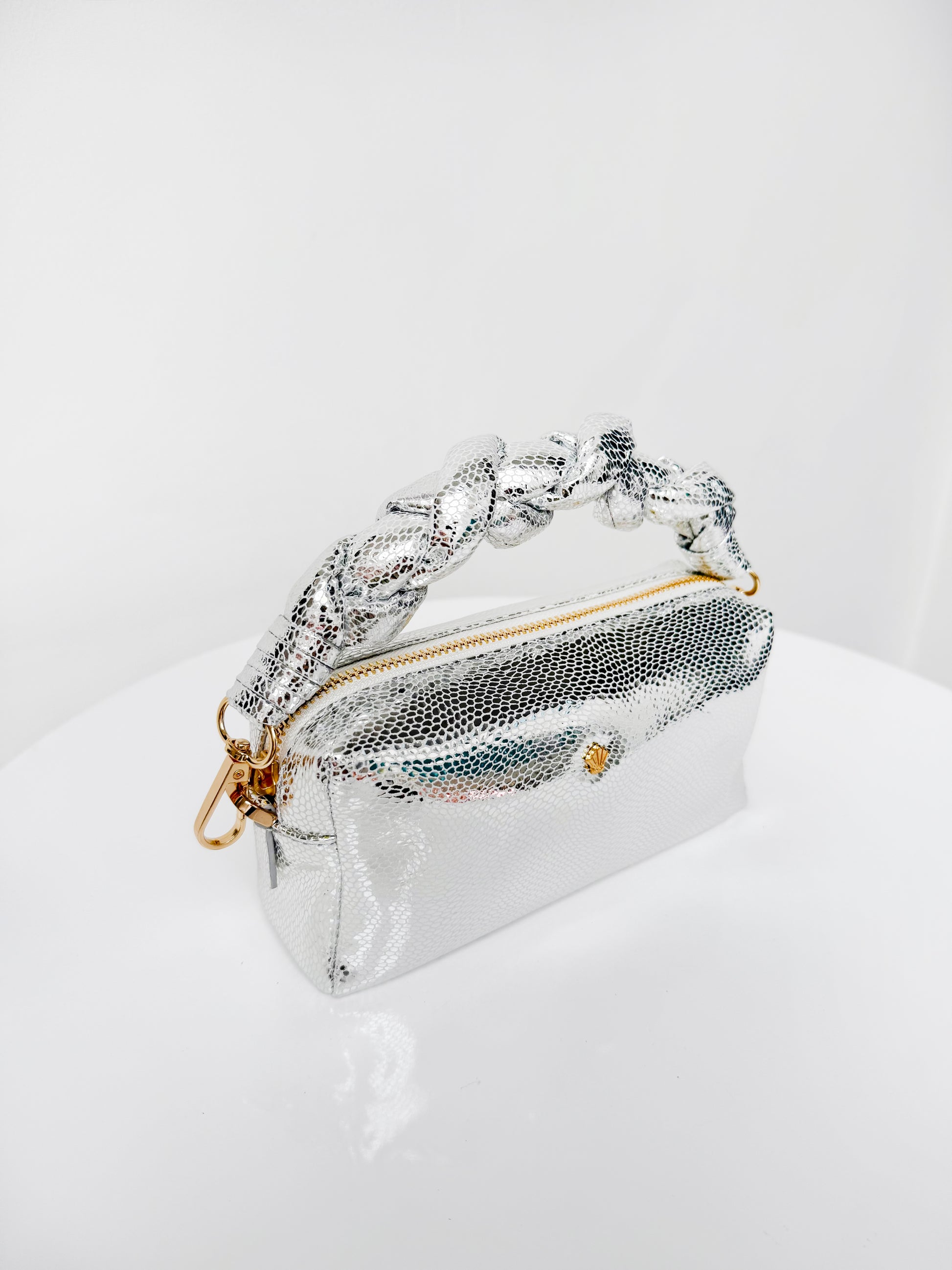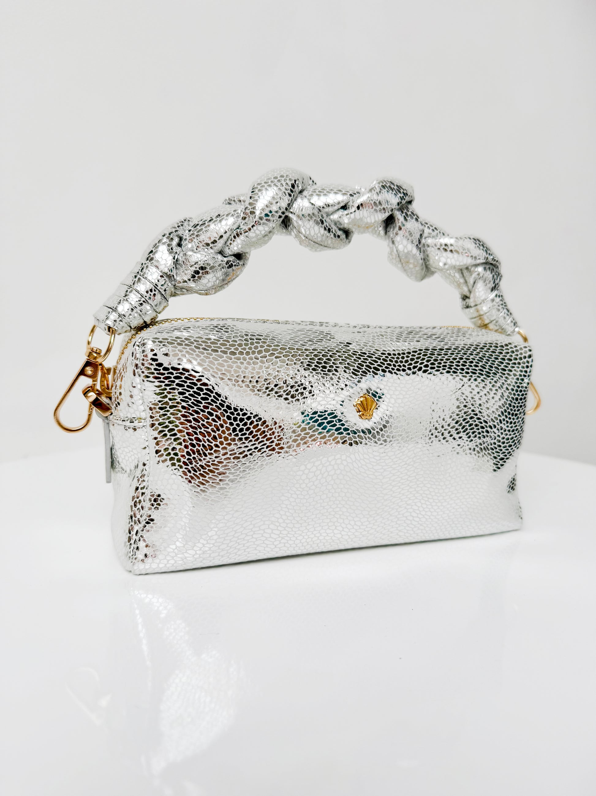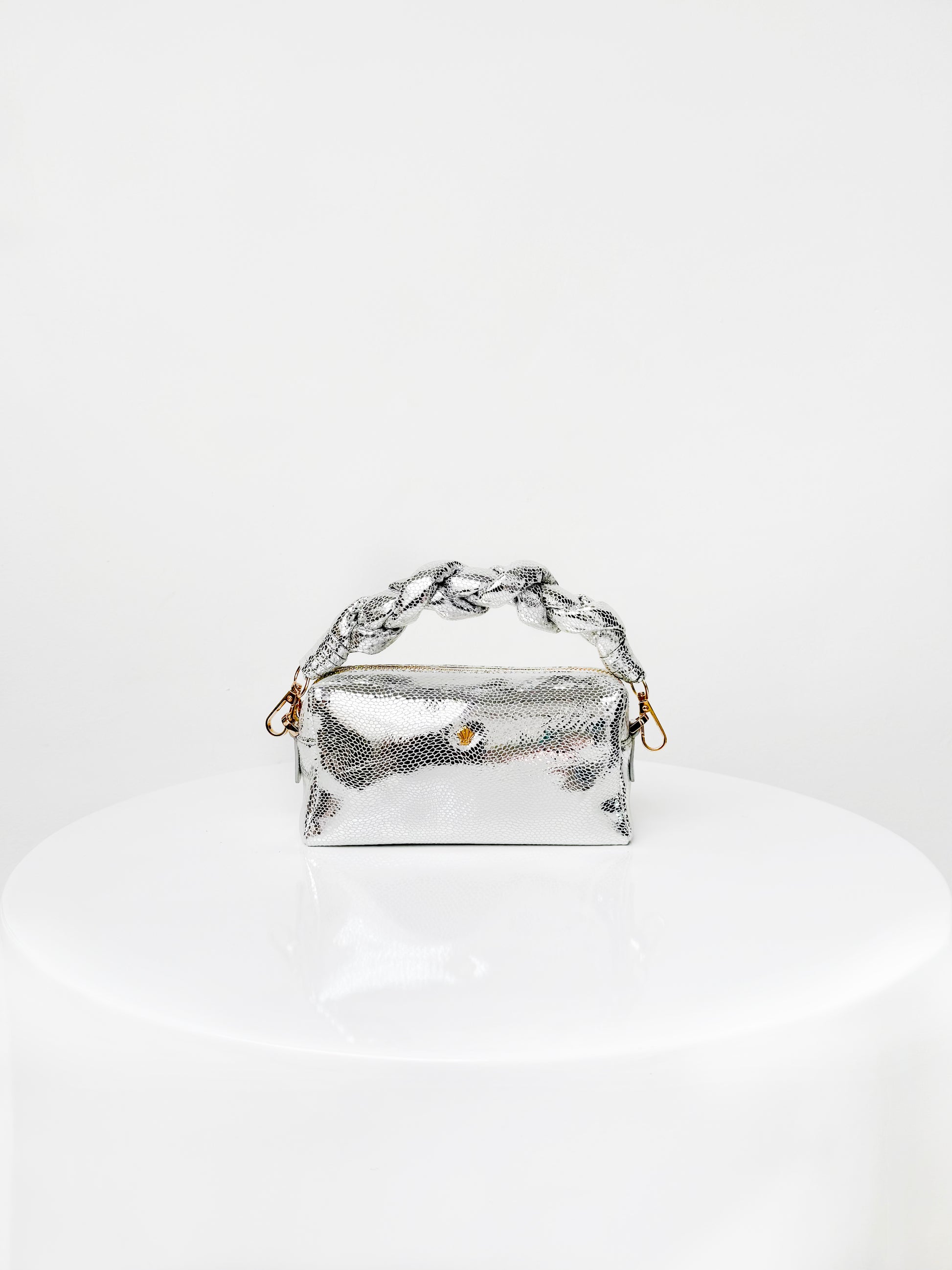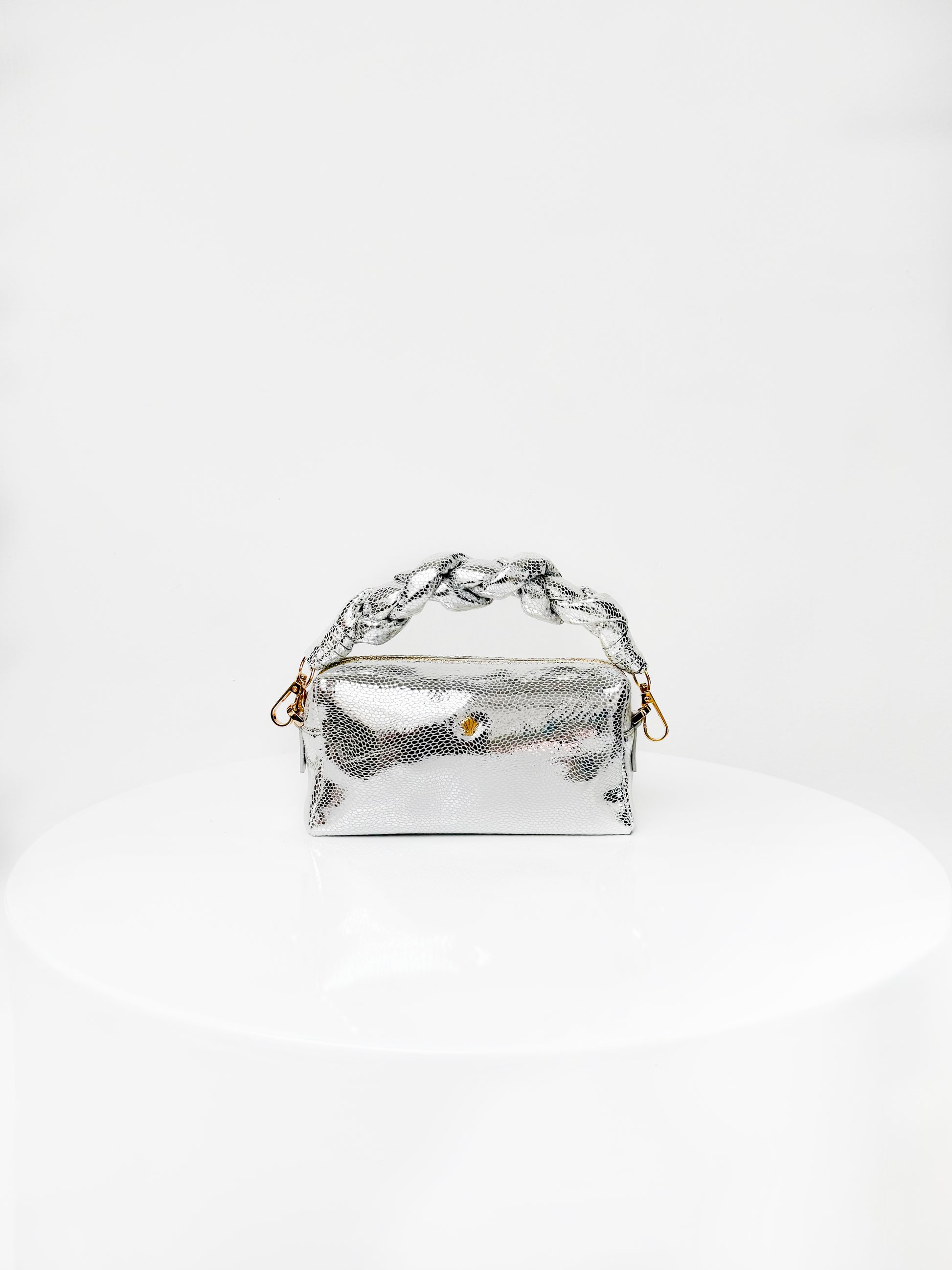 Nuestro Cosmo Plata es una joya contemporánea de la colección Óleo de Pompa Rosa, donde la modernidad se encuentra con la poesía del arte francés. Su silueta pequeña y femenina, elaborada en cuero folia vacuno 100% colombiano, refleja la maestría del lujo artesanal de nuestra tierra con un guiño a la elegancia parisina.
