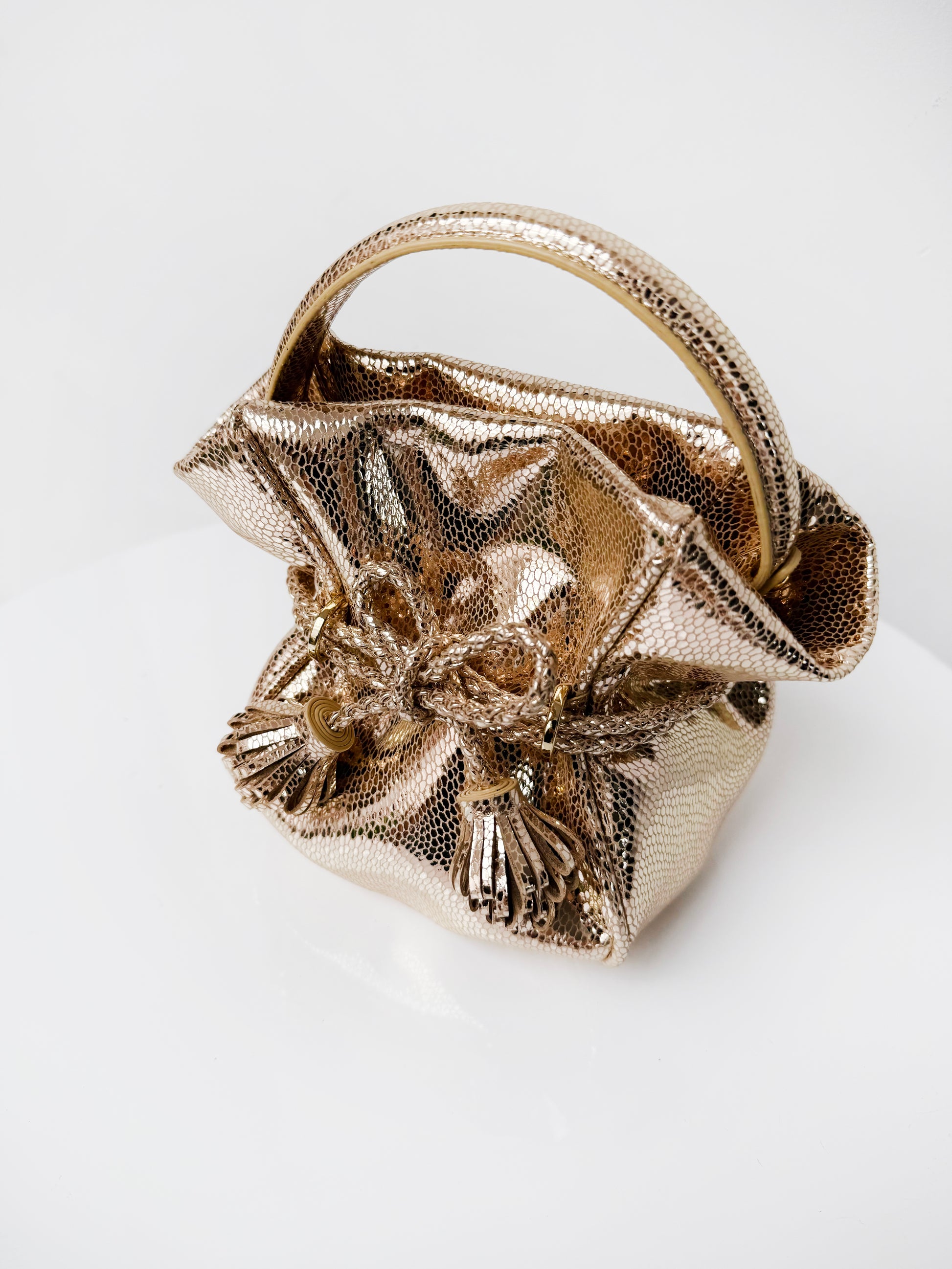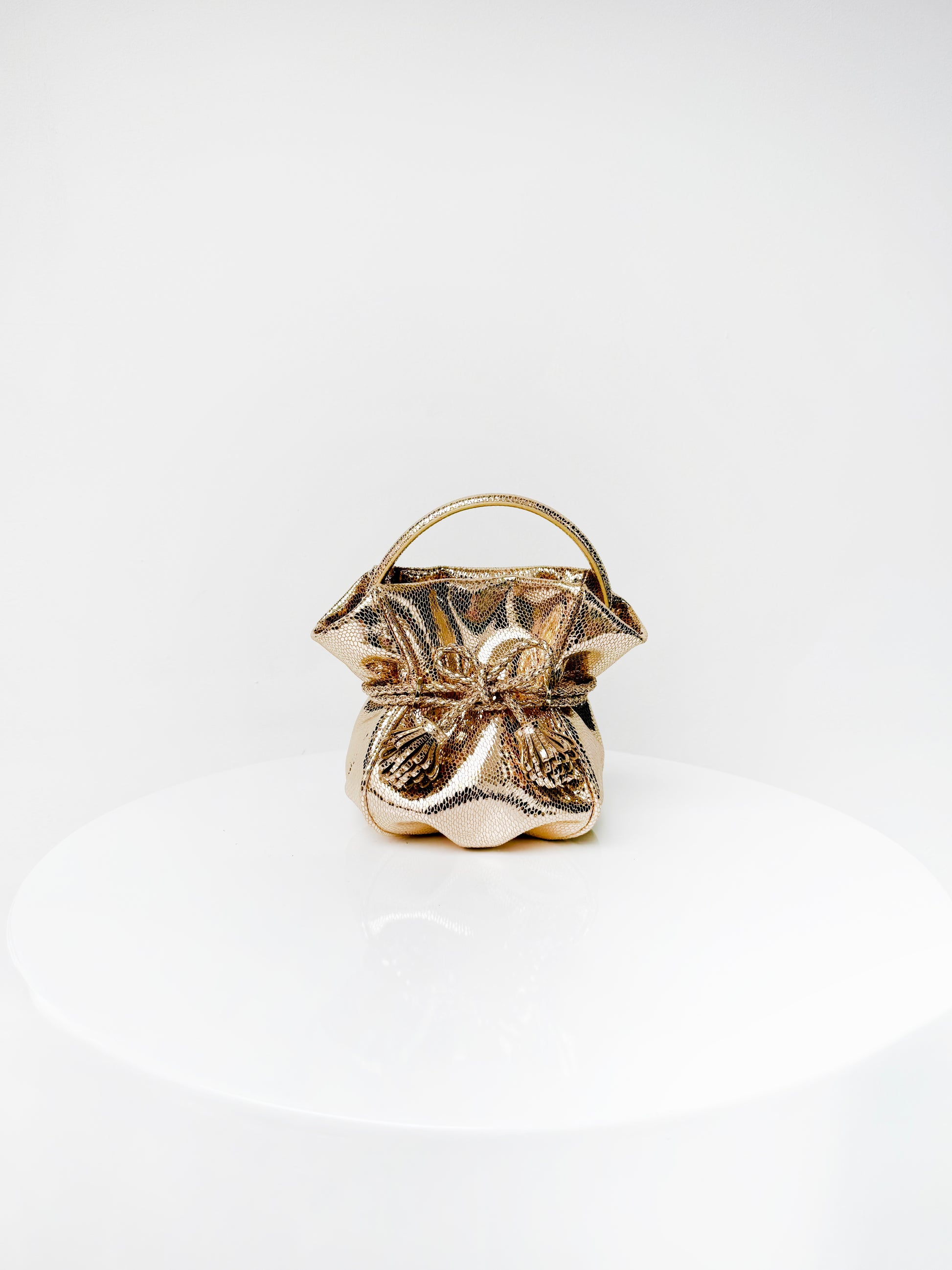 Nuestro Louis XVI Dorado es una pieza de la colección Óleo de Pompa Rosa, un homenaje al arte francés donde la feminidad se retrata en formas románticas y atemporales. Elaborado en cuero folia vacuno 100% colombiano, su diseño refleja el encuentro entre la tradición artesanal de nuestra tierra y la delicadeza parisina.