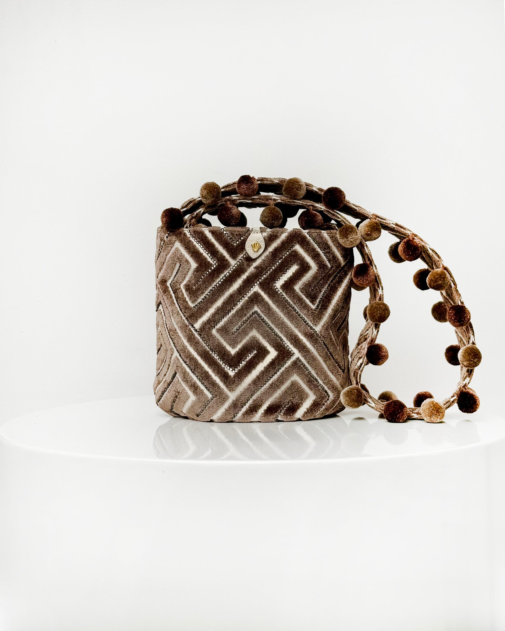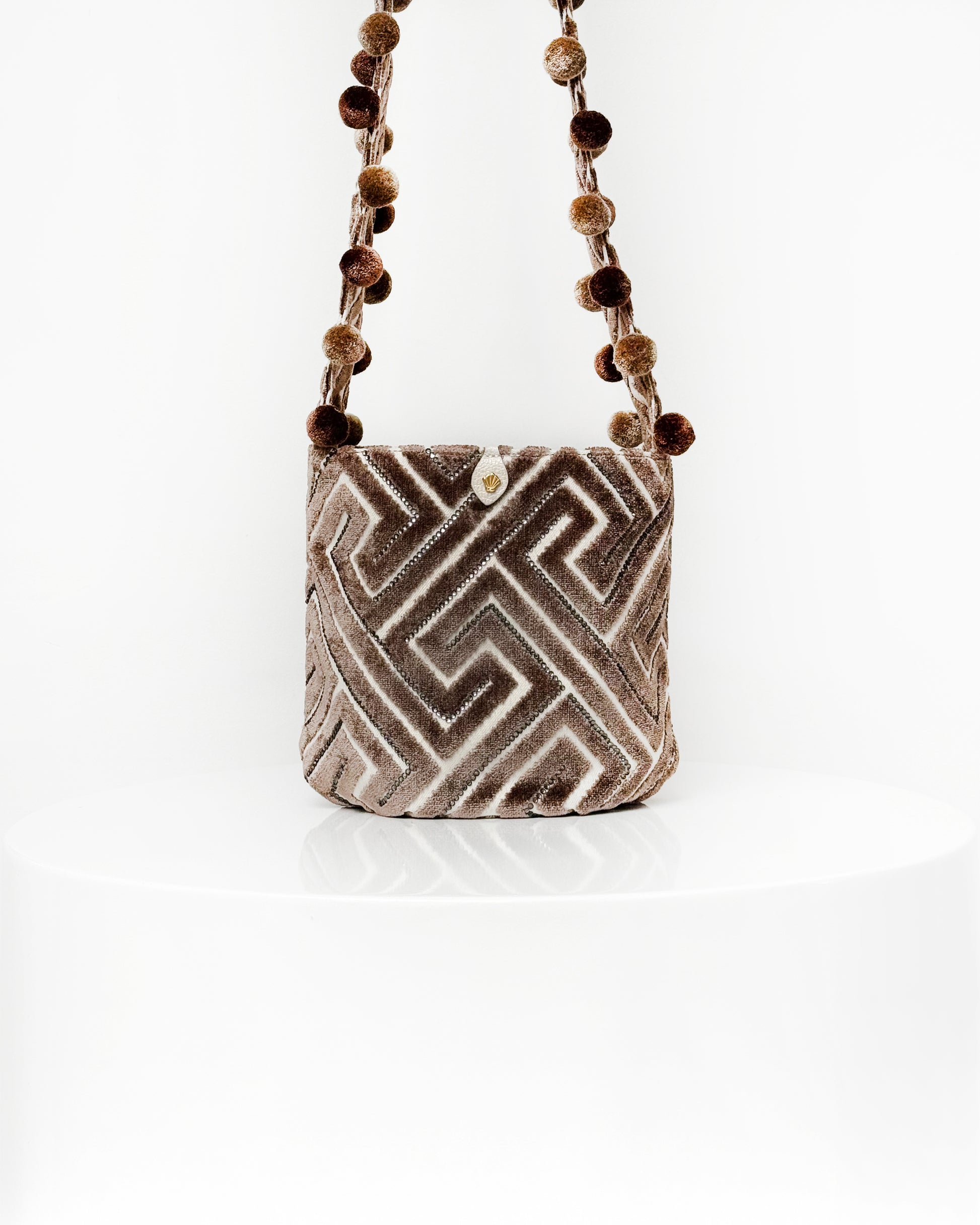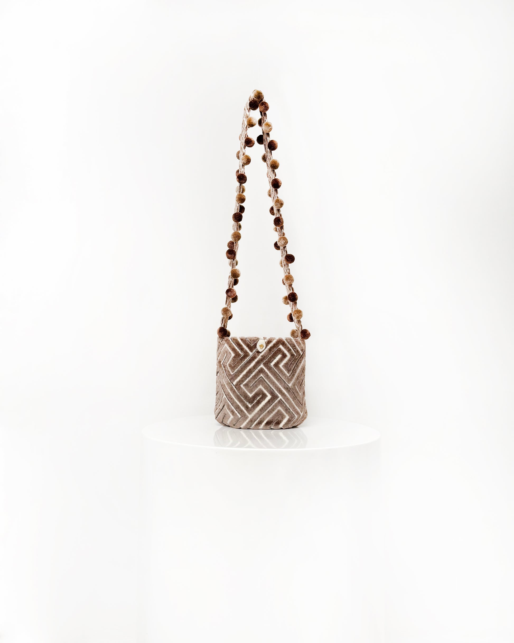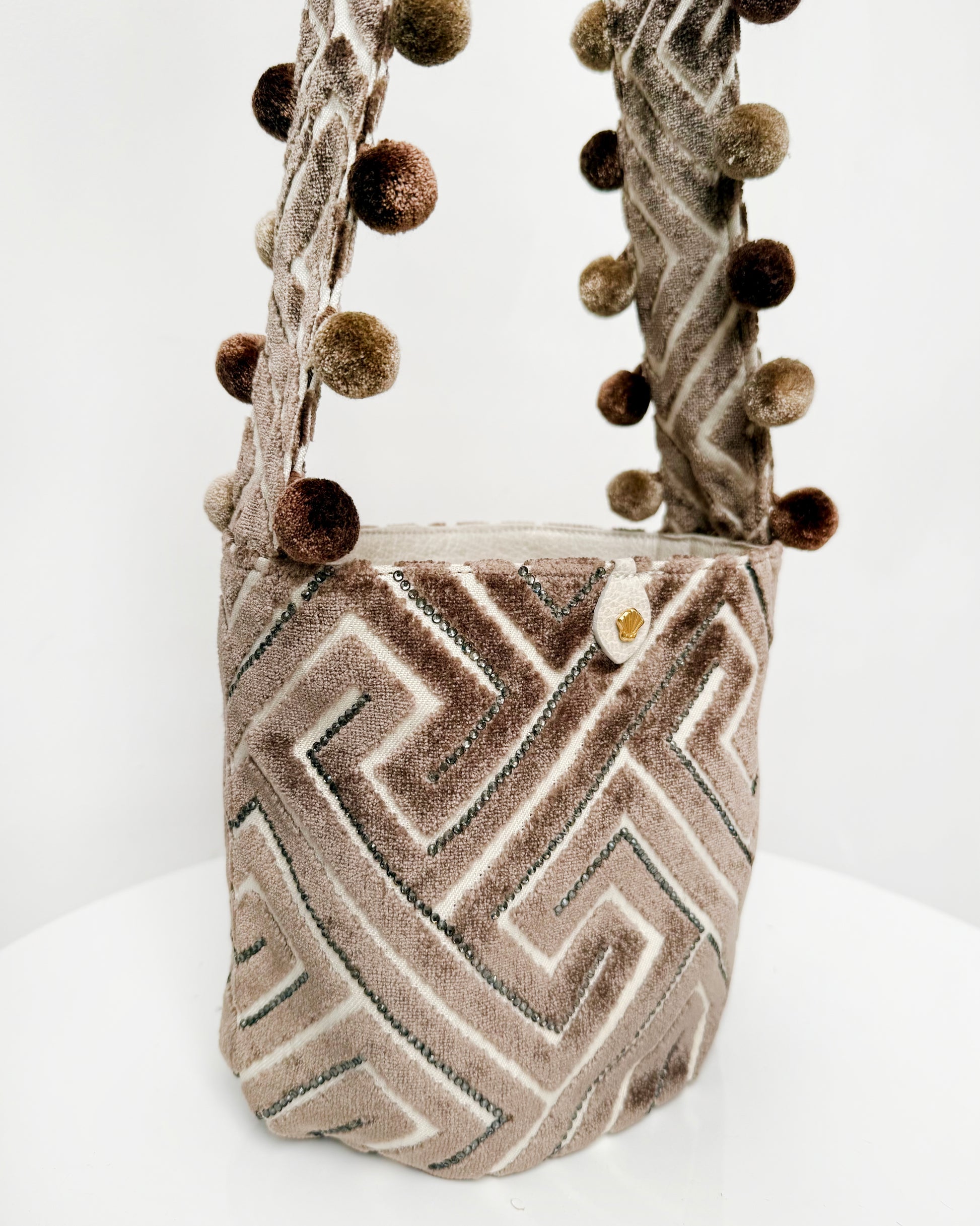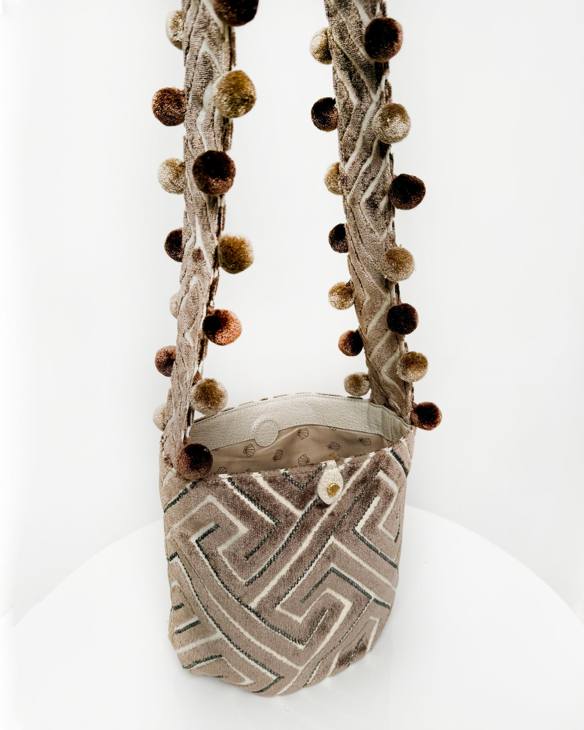 Decorada con pompones a lo largo de su asa larga para colgar, esta pieza se convierte en un accesorio único y especial.