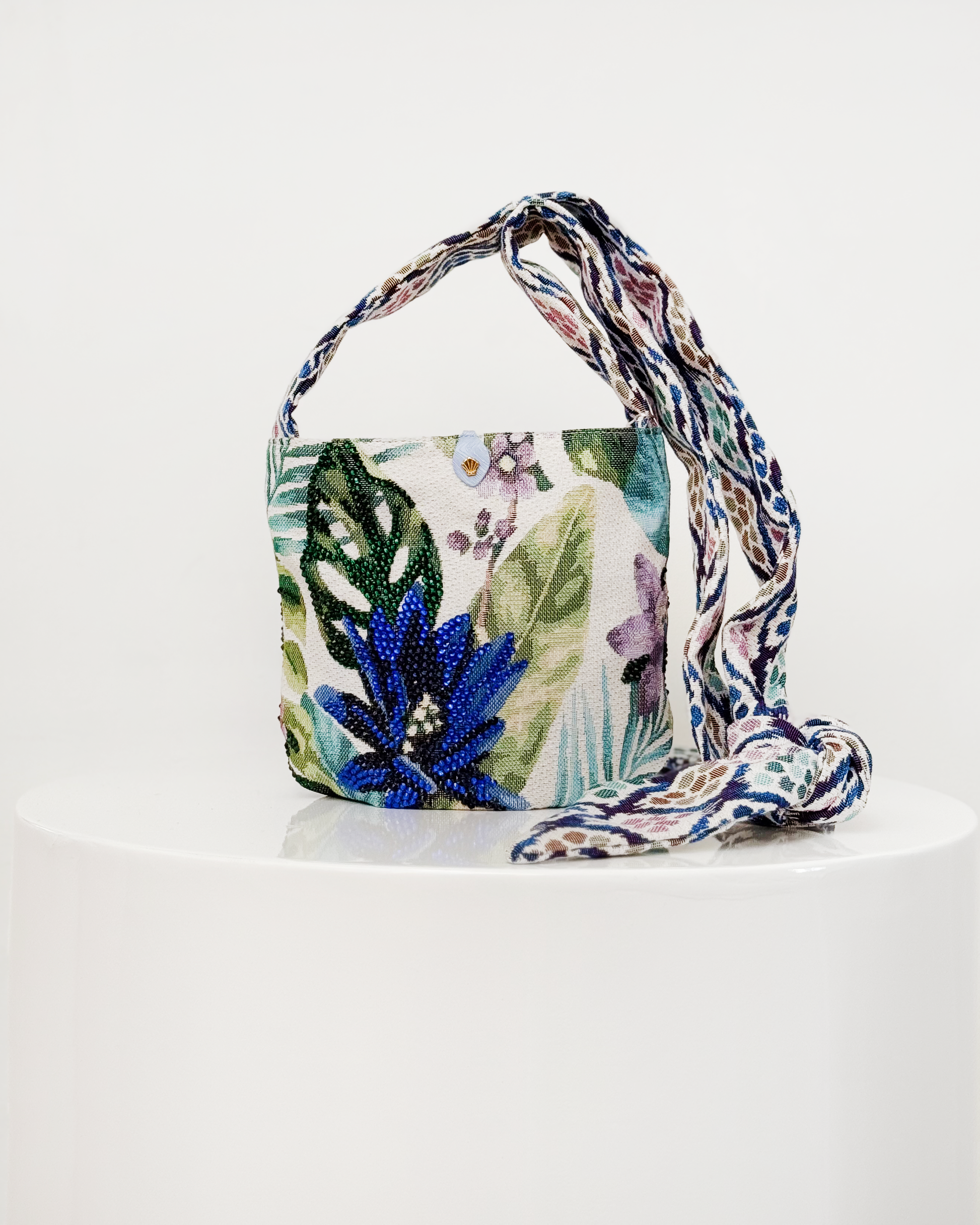 Nuestra Martinique ND está confeccionada en gobelino y cuero vacuno 100% colombiano. Cada pieza es cuidadosamente decorada a mano con cristales, resaltando el carácter artesanal y el brillo sutil que distingue a Pomparosa.