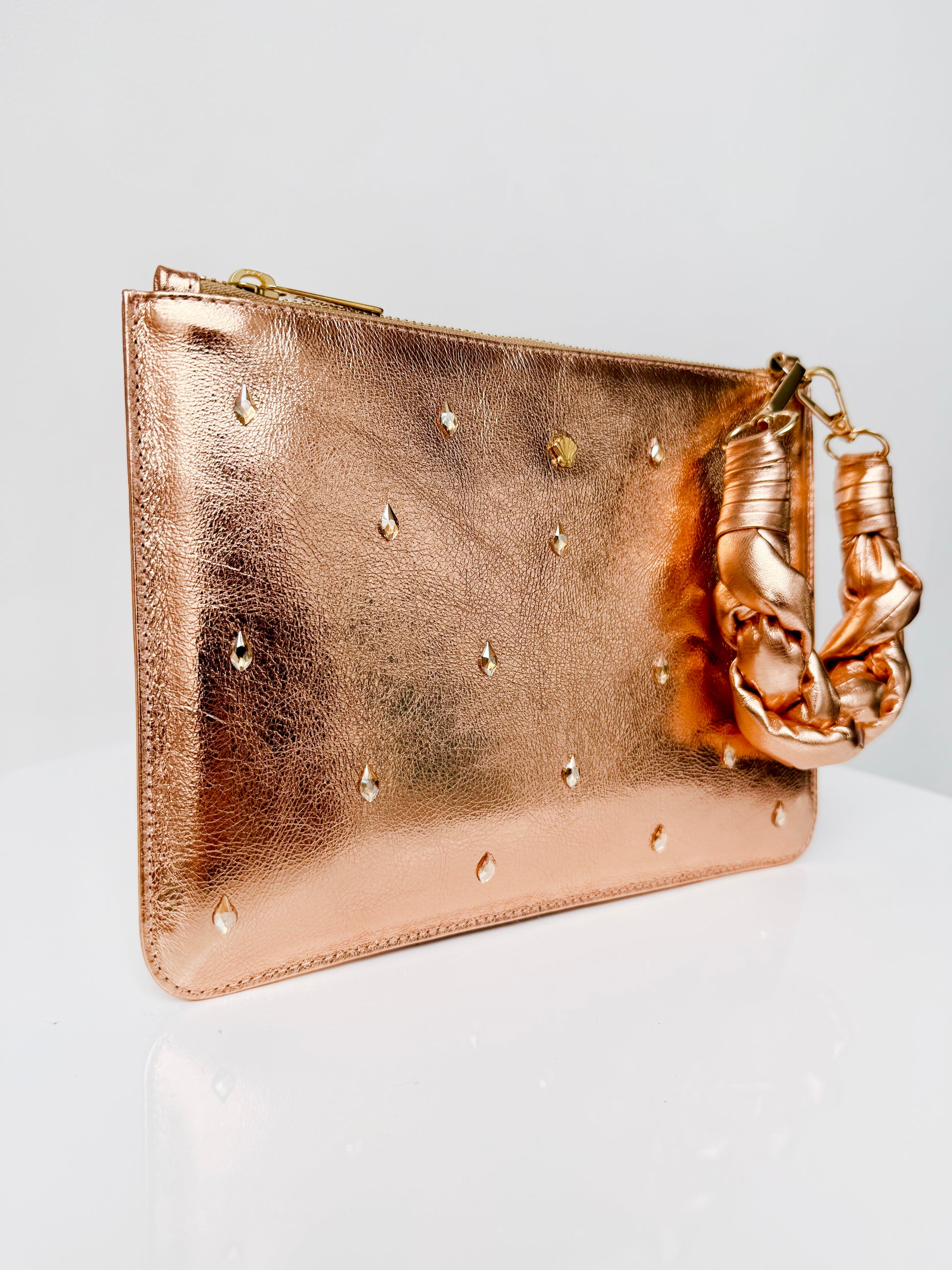 El Mini Clutch Floret es una cartera de noche exclusivo elaborado en cuero folia vacuno metalizado en color latón, 100% colombiano, con un acabado brillante que refleja lujo y sofisticación. Sus detalles de herrajes en zamac bañados en oro de 24K y la delicada decoración artesanal con gotas de cristal hacen de esta pieza un accesorio elegante y lleno de distinción.