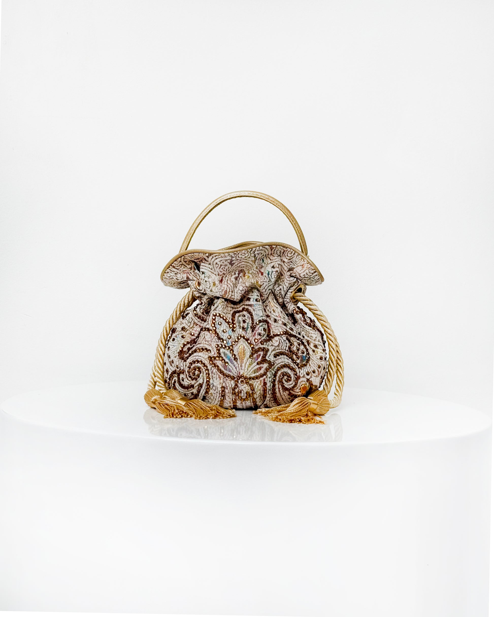 Está confeccionada en Gobelino y cuero vacuno 100% colombiano, con un sistema de cierre en cordones de hilos de seda, rematados con borlas hechas a mano que aportan un toque delicado y sofisticado. Cada bolso está decorado cuidadosamente a mano con cristales y terminado con herrajes en zamac con baño en oro de 24K.