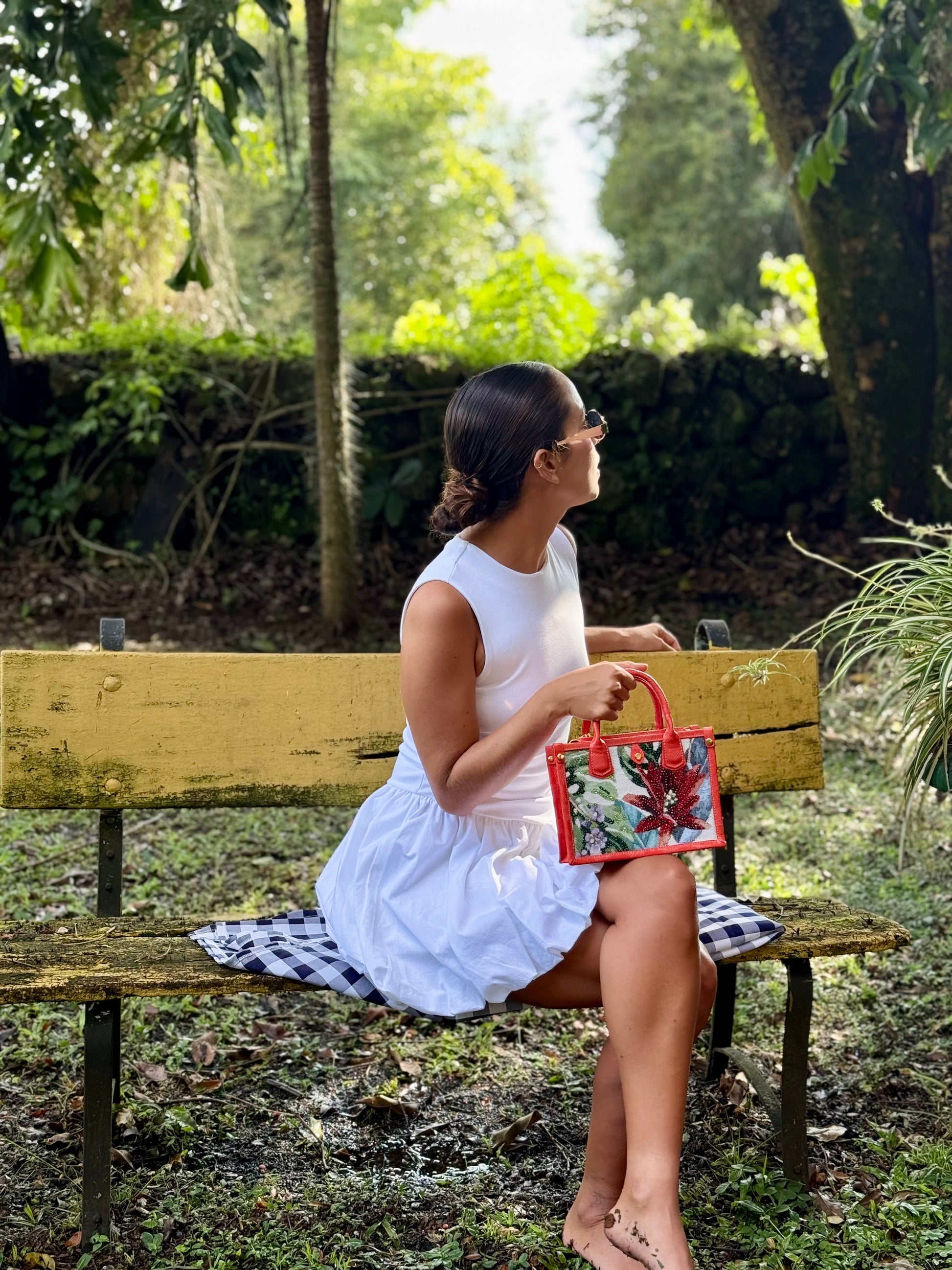 Nuestra Mini Shopper Rivera está confeccionada en cuero vacuno 100% colombiano, con la parte frontal en gobelino que le aporta un contraste de textura y un toque elegante, con detalles decorados cuidadosamente a mano con cristales.