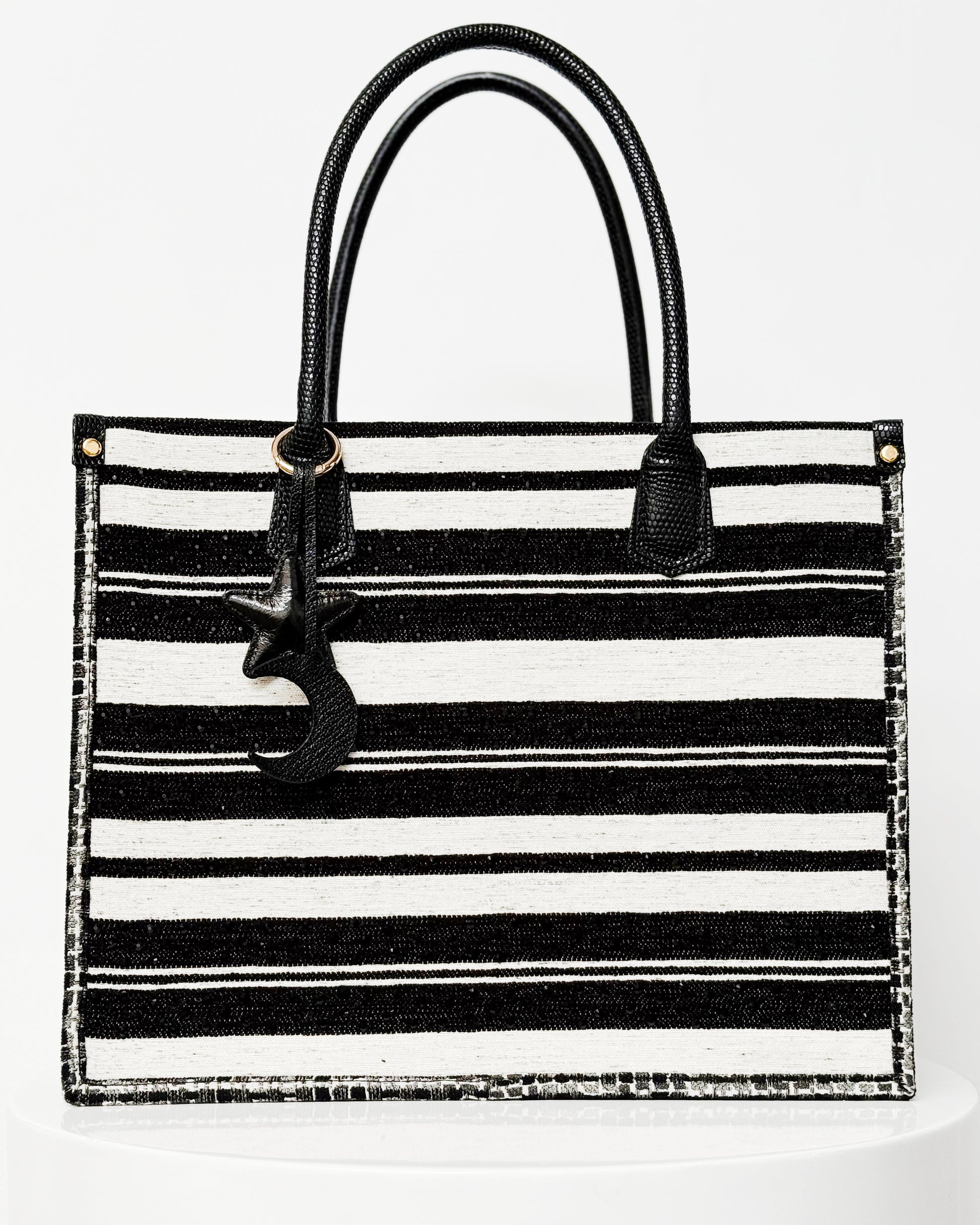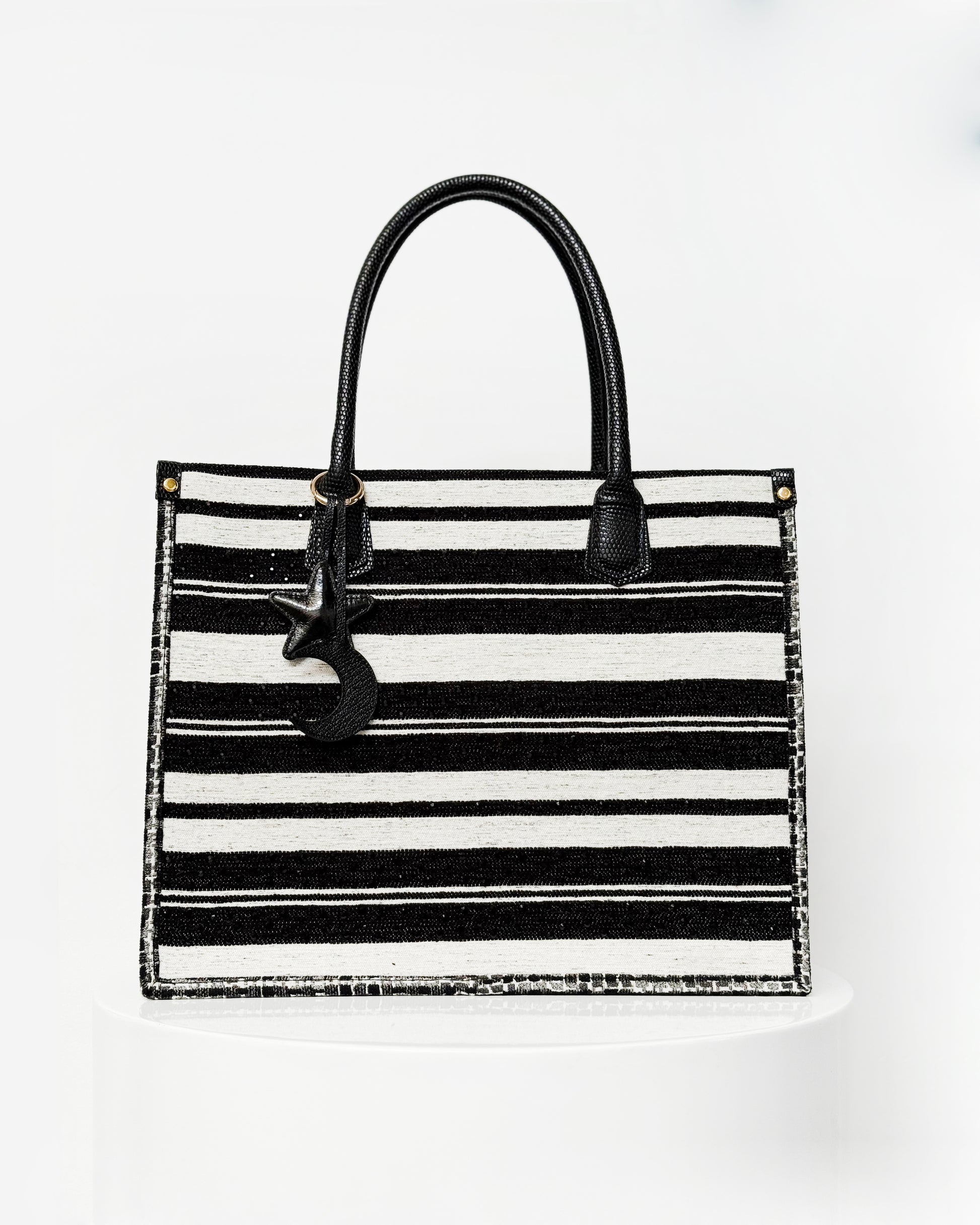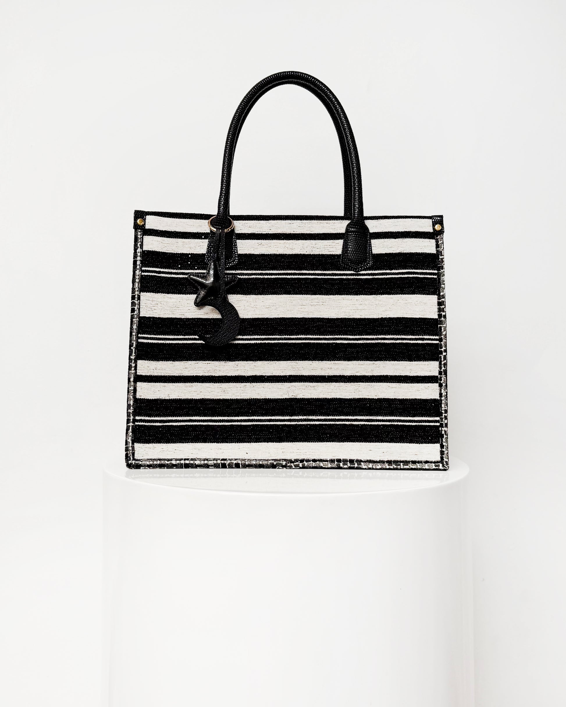 Está elaborada en tela chenill de rayas blanco y negro, una textura envolvente que dialoga con el contraste clásico y se ilumina con brillantes dorados pegados a mano, aplicados como pequeñas joyas que capturan la luz en cada movimiento.
