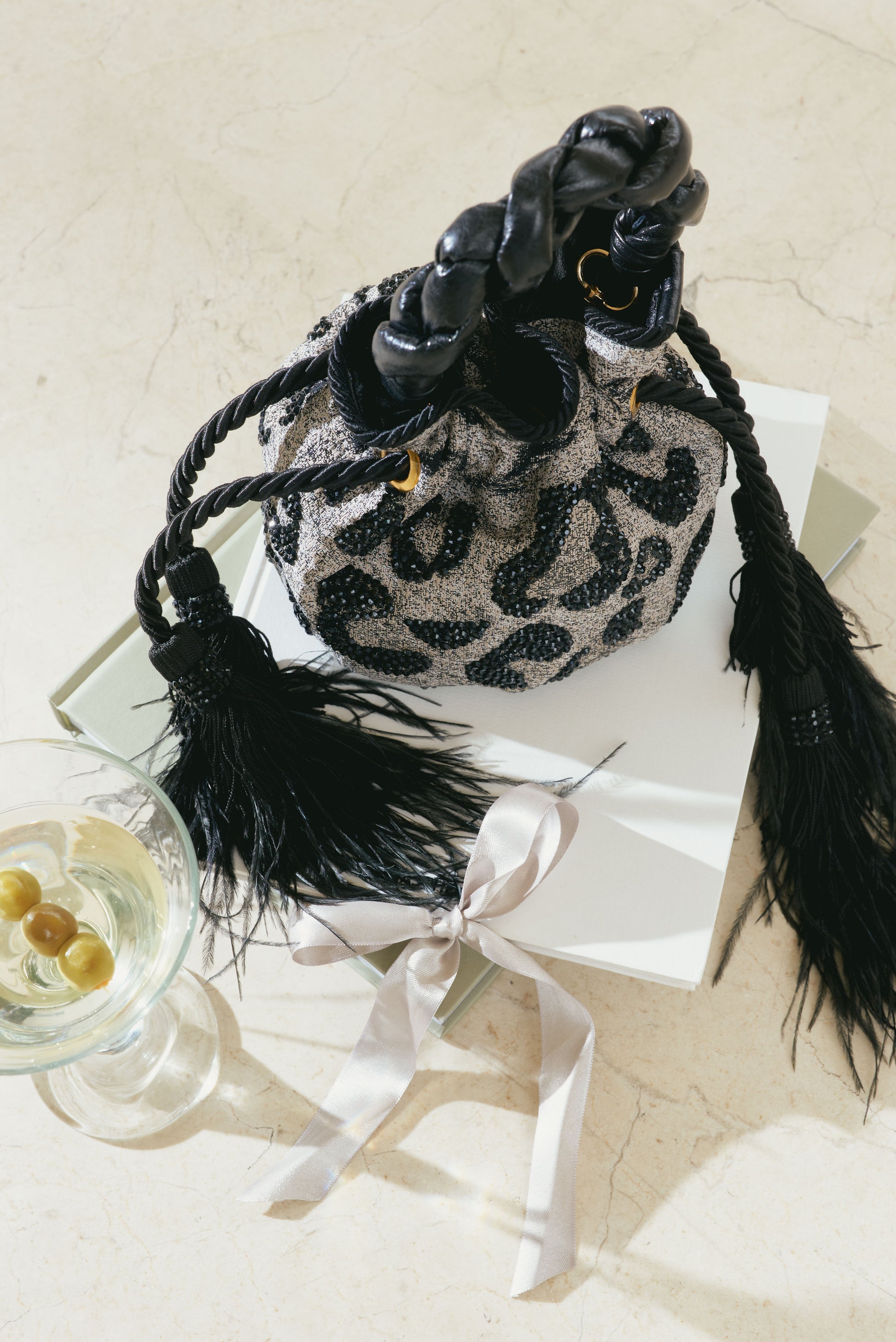 Nuestra Sofía Animalier Boucher Bucket Bag está confeccionada en gobelino y cuero vacuno 100% colombiano. Su sistema de cierre utiliza cordones de hilos de seda, rematados con borlas hechas a mano elaboradas en flecos de seda y plumas, que aportan un movimiento delicado y un acabado artesanal único.