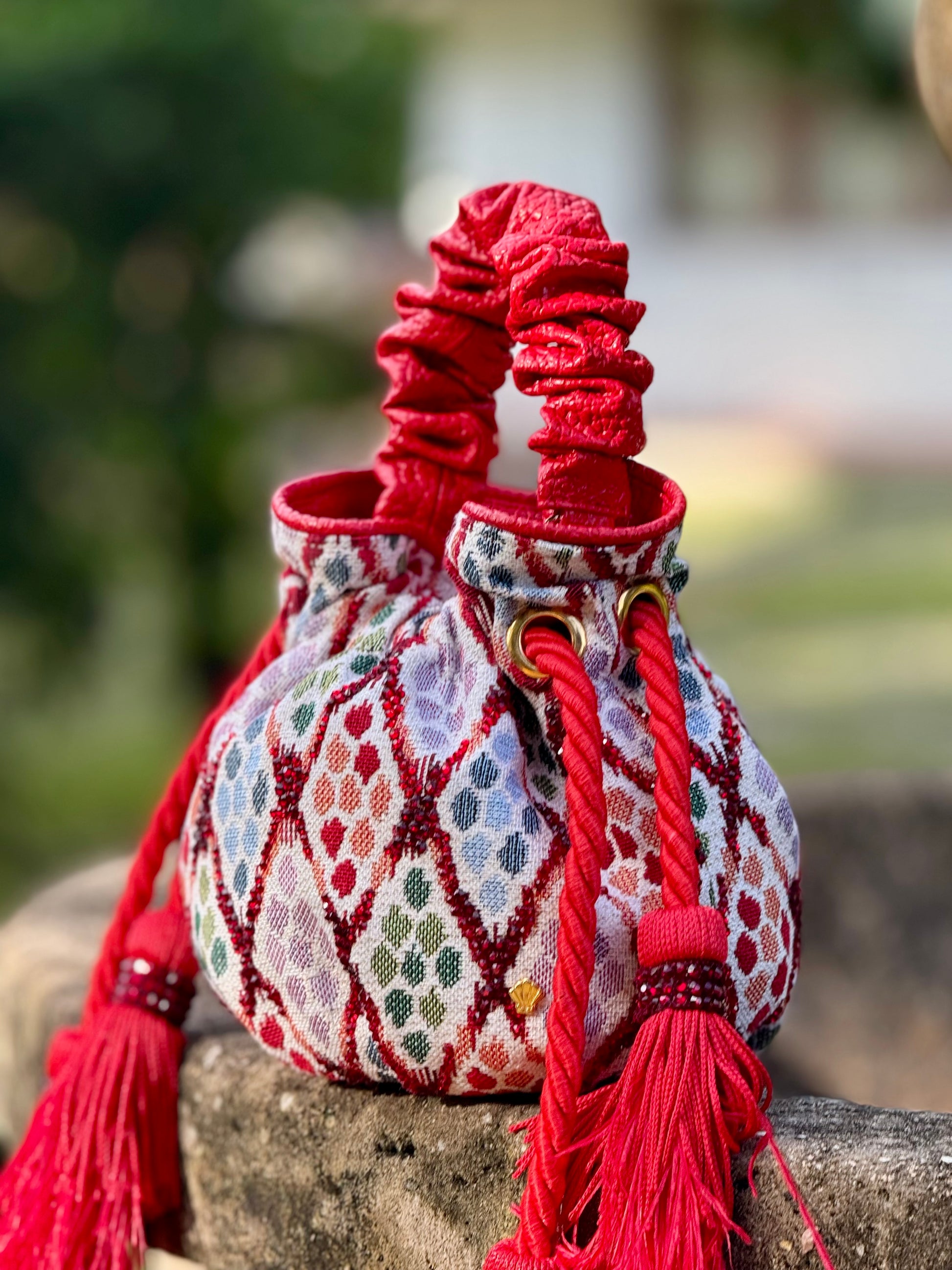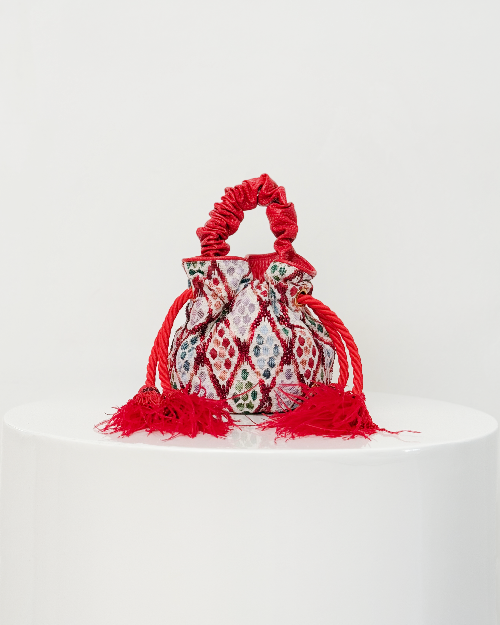 Nuestra Boucher Bucket Bag está confeccionada en gobelino y cuero vacuno 100% colombiano. Su sistema de cierre utiliza cordones de hilos de seda rematados con borlas hechas a mano, elaboradas con flecos de seda y plumas naturales.